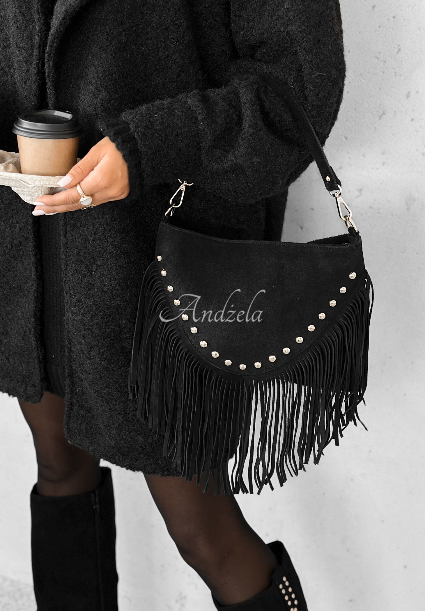 A suede handbag made of high-quality natural leather. It is a single-compartment model with a zipper closure and a functional zippered pocket, located on the inside. It has a shorter handle, as well as an adjustable, detachable strap. Gold details and decorative tassels complete the look.