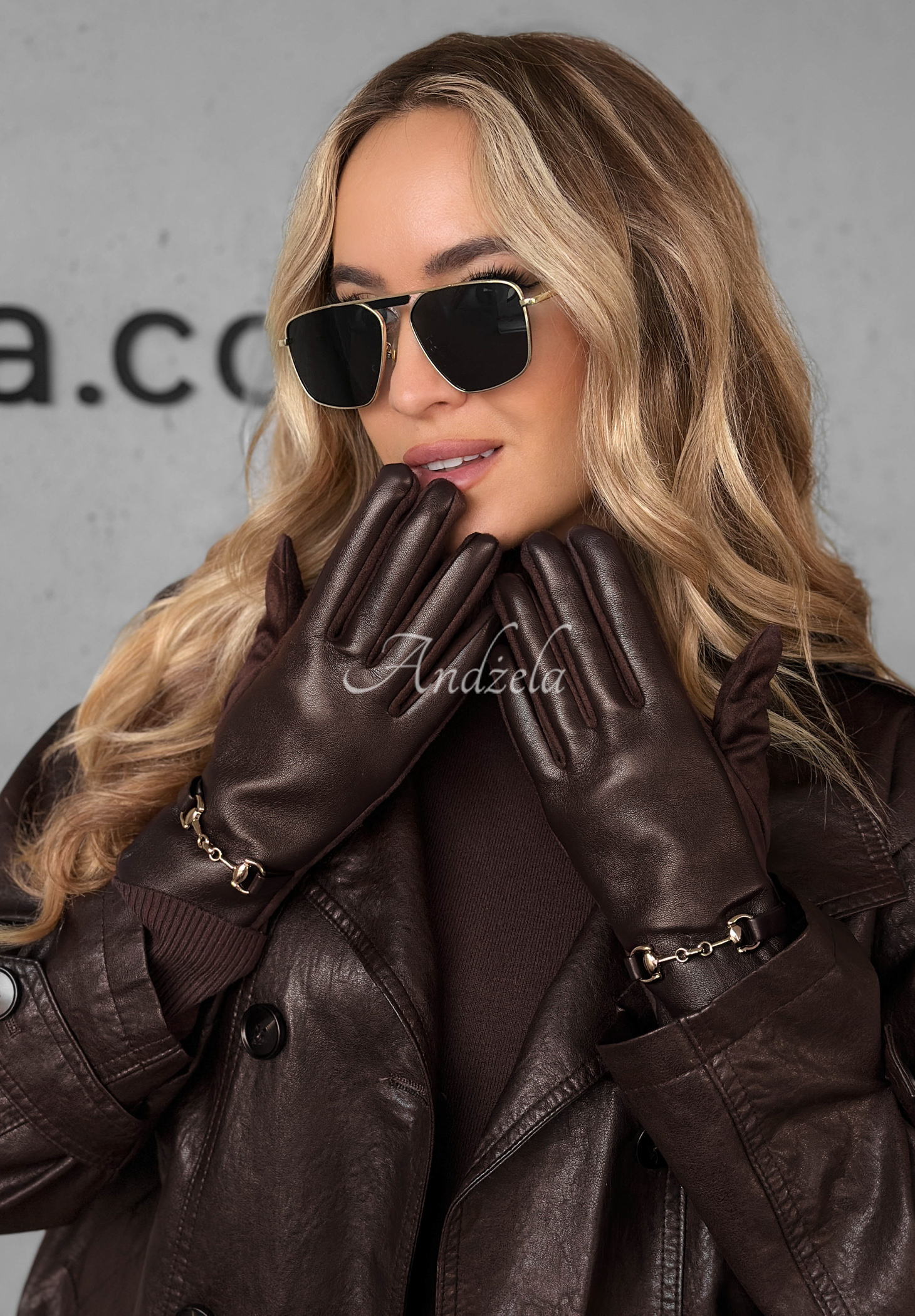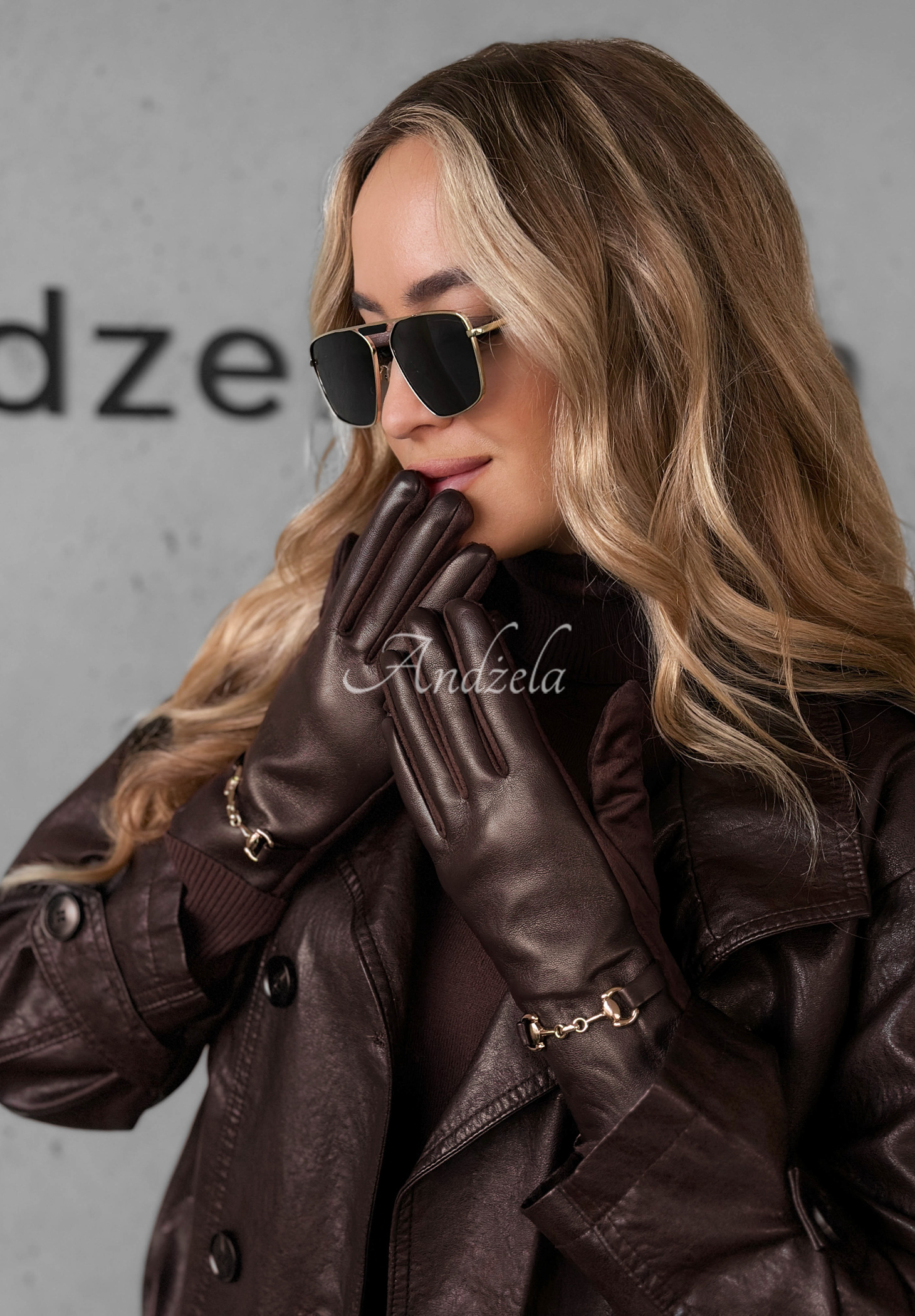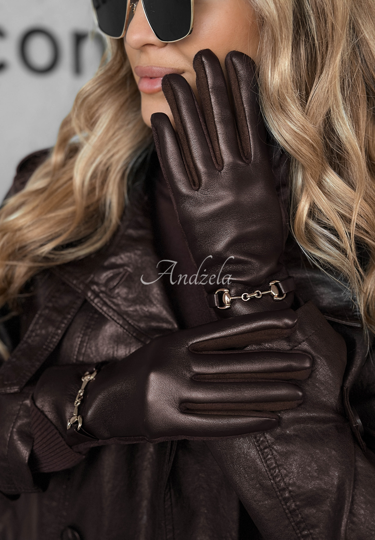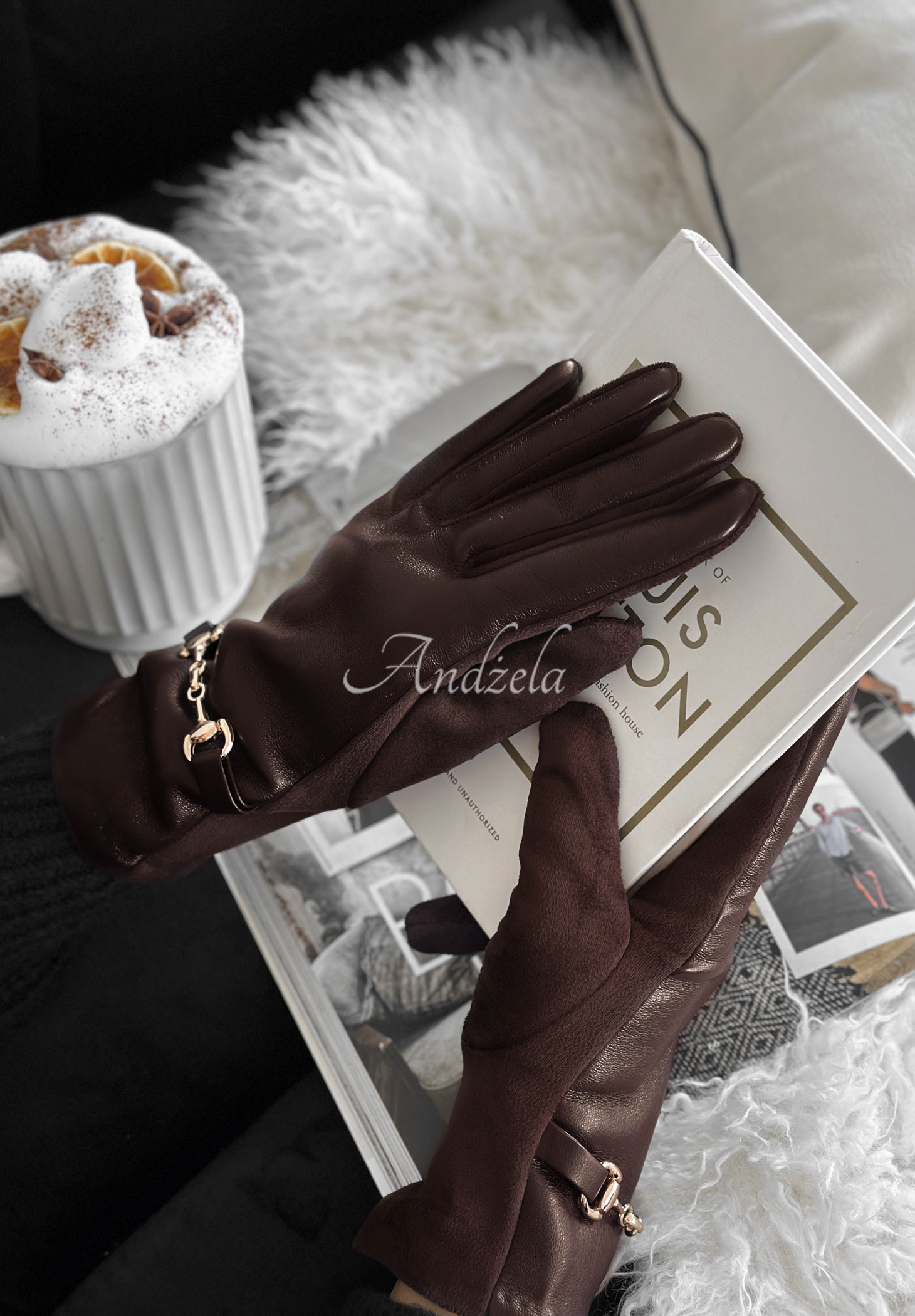 Gloves made from a combination of suede material and imitation leather are an accessory perfect for winter. The model with soft insulation on the inside is distinguished by a gold element at the wrist. In addition, the index finger and thumb have special applications that allow you to use your phone. Available in several color versions.