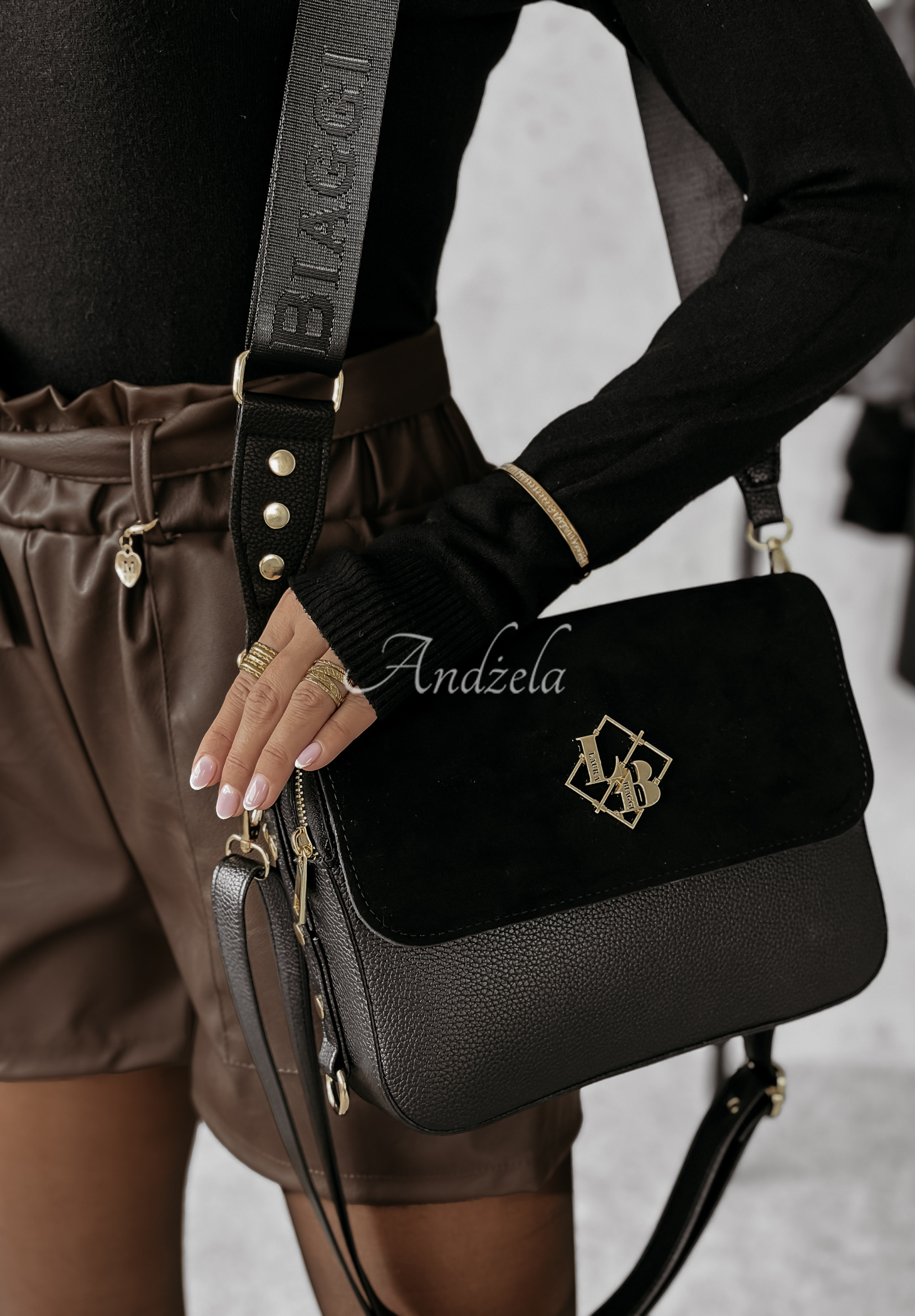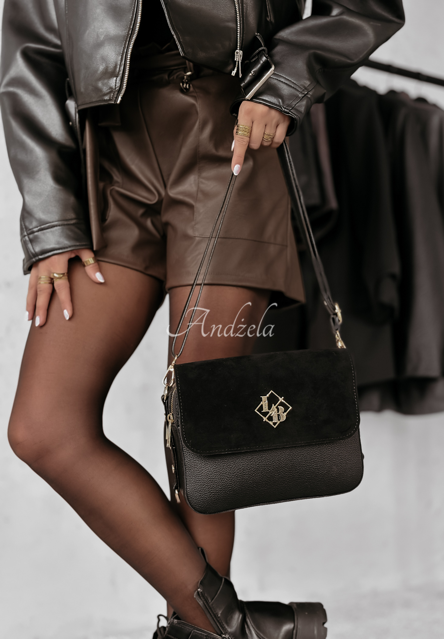 This fashionable handbag is made of a combination of two materials: leather and suede. It is a model with two compartments and a functional zipper pocket, which allows you to organize the contents well. It has two adjustable straps. This proposal is fastened with zippers, the whole thing is completed with gold details, giving it elegance.