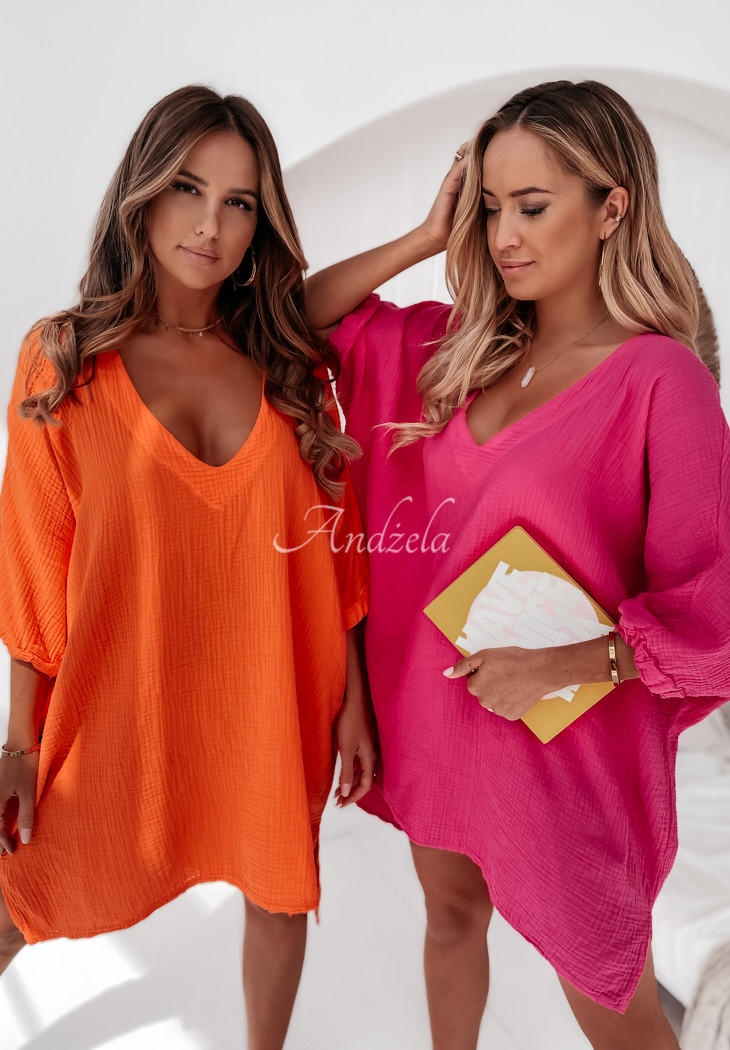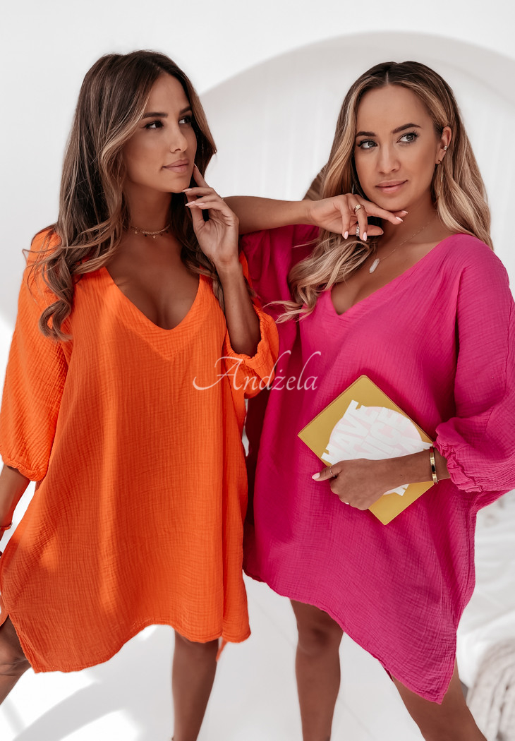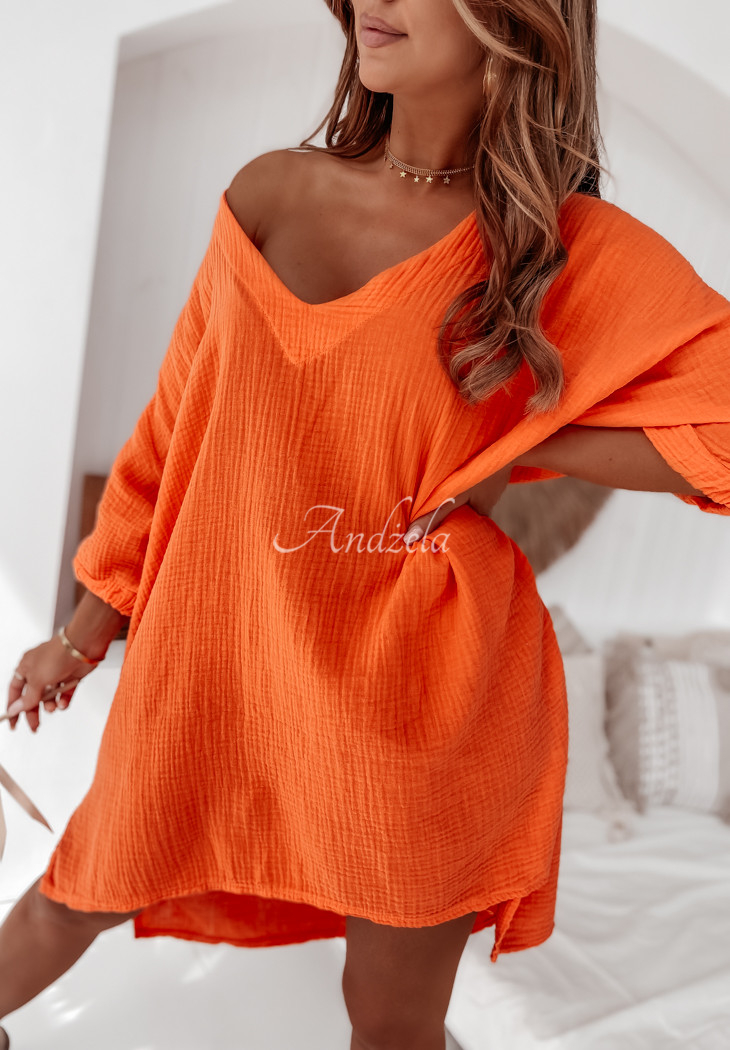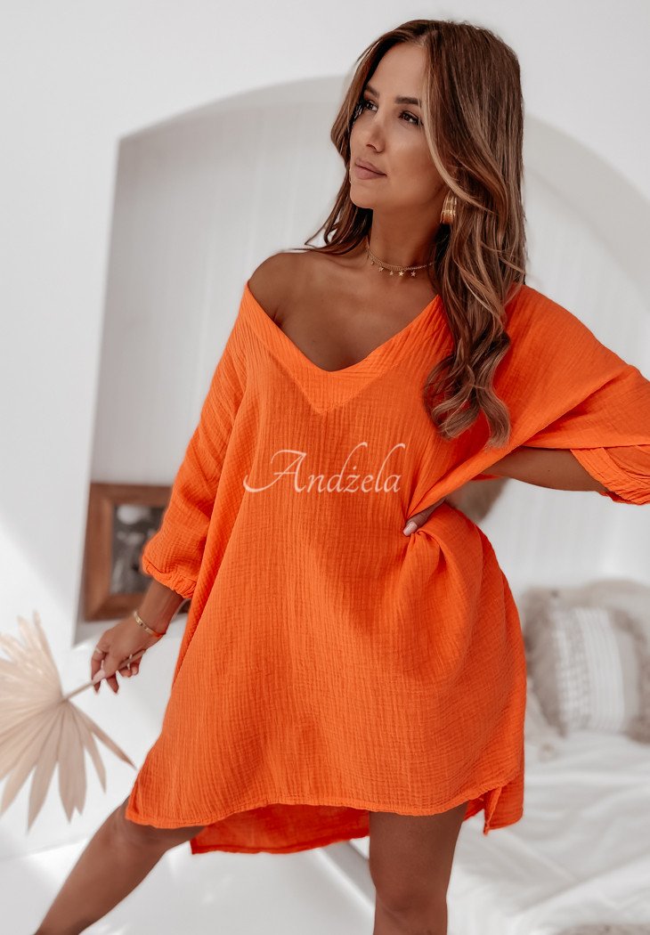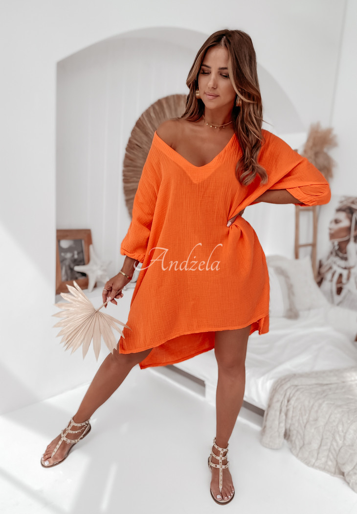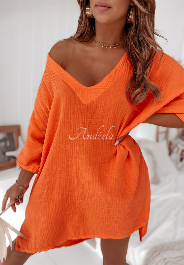 A muslin tunic with an asymmetrical cut is a proposition that should necessarily find its way into every closet. The model has a deep-cut neckline, which makes the whole look extremely feminine. The blouse will be a fantastic choice when creating everyday styling, which will undoubtedly look great, but also provide you with comfort.