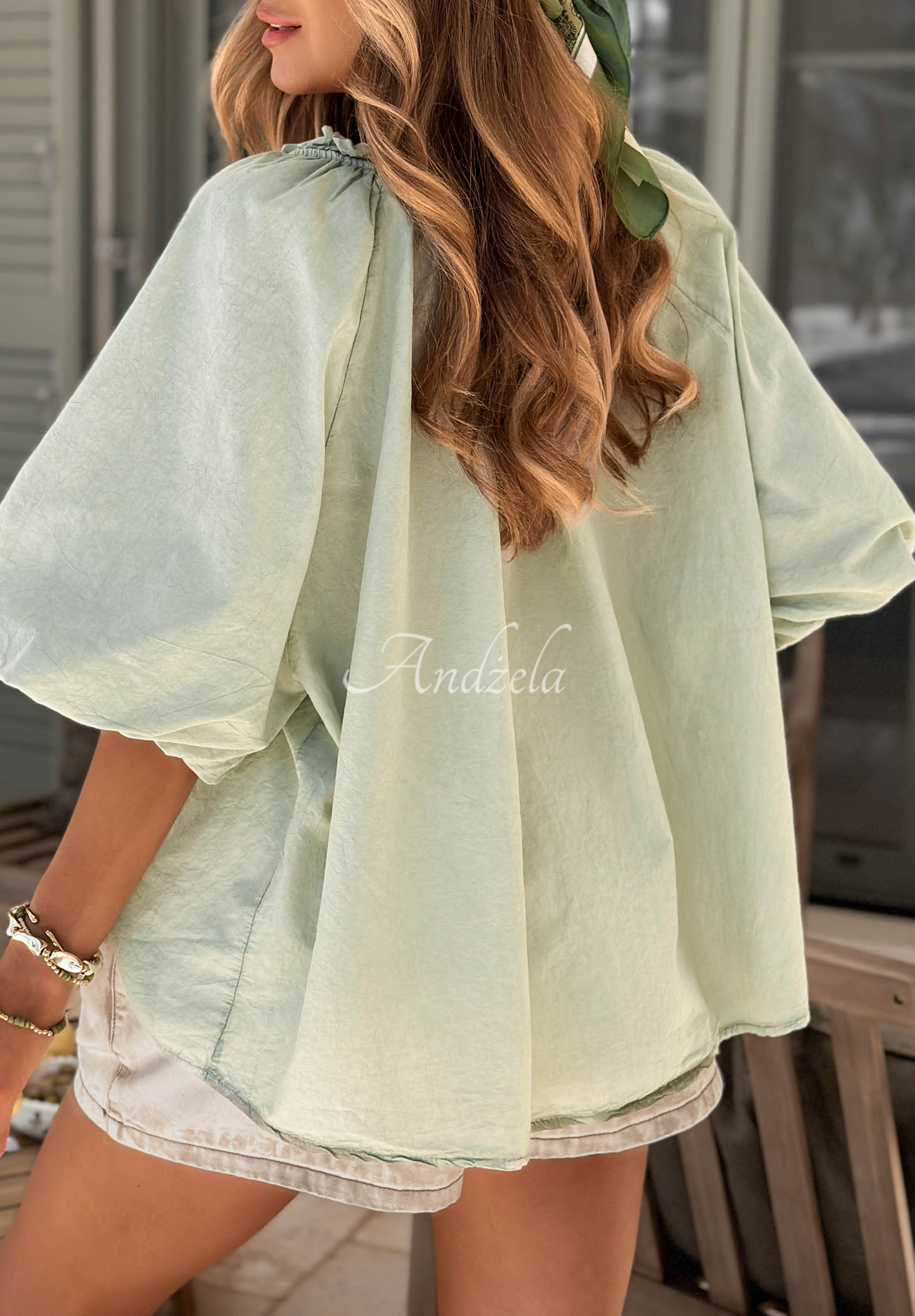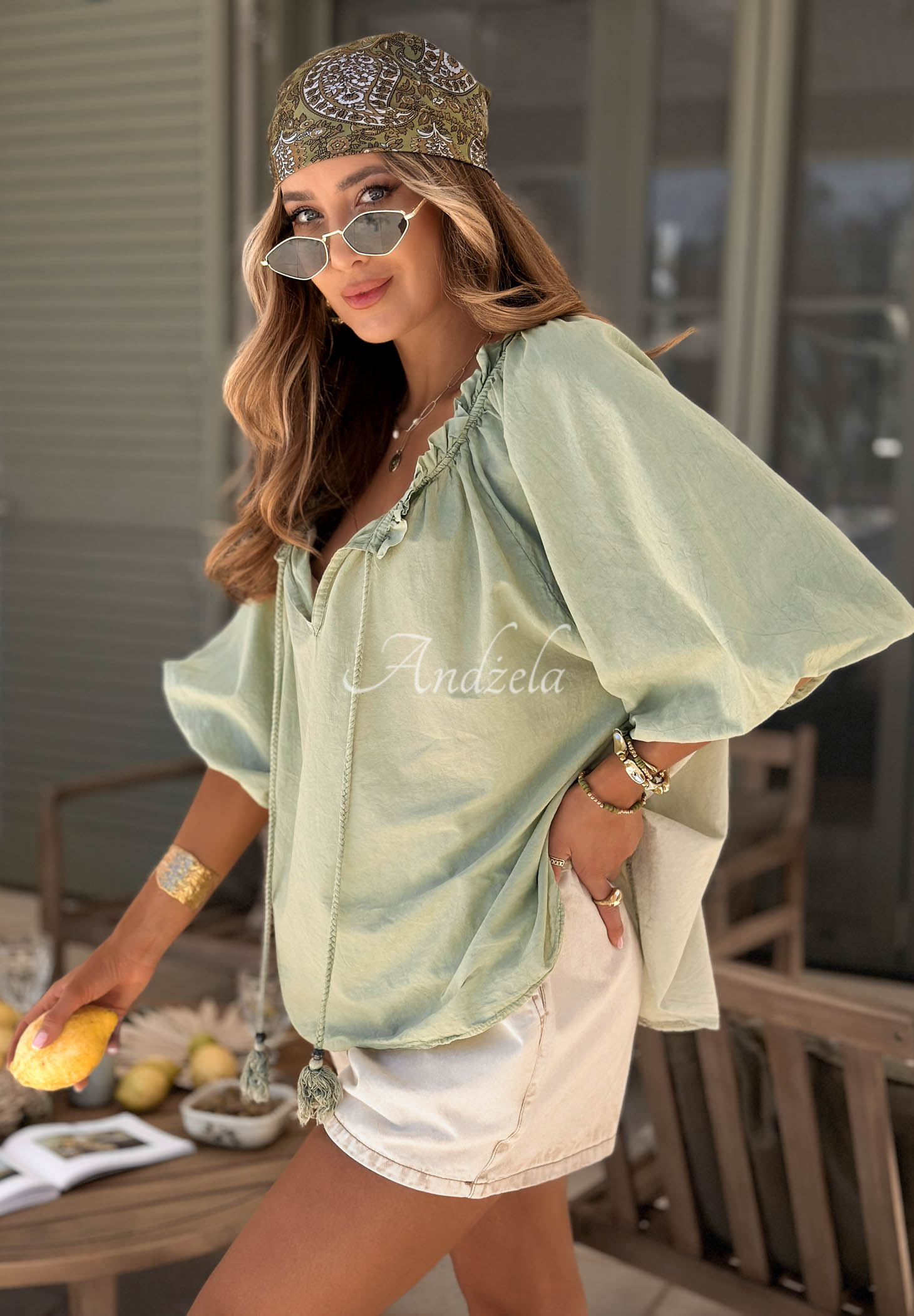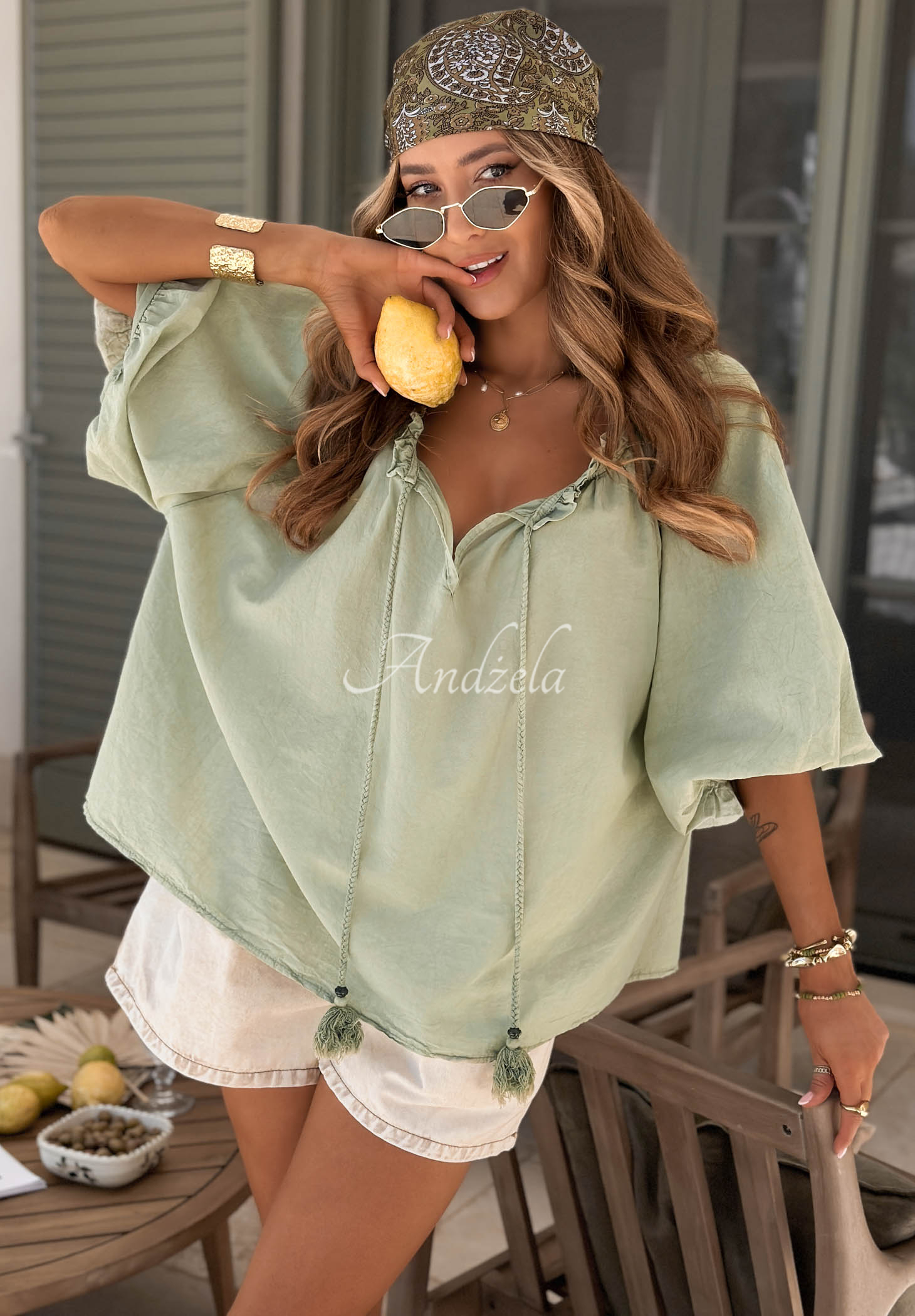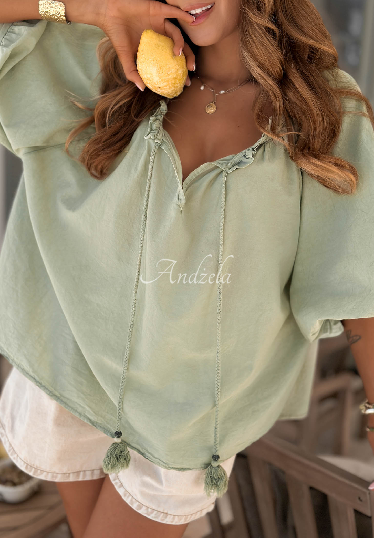 A lightweight blouse made of high-quality cotton. It features short, puffed sleeves. This style has a feminine, cut-out neckline adorned with delicate ruffles and a braided tie at the front.
