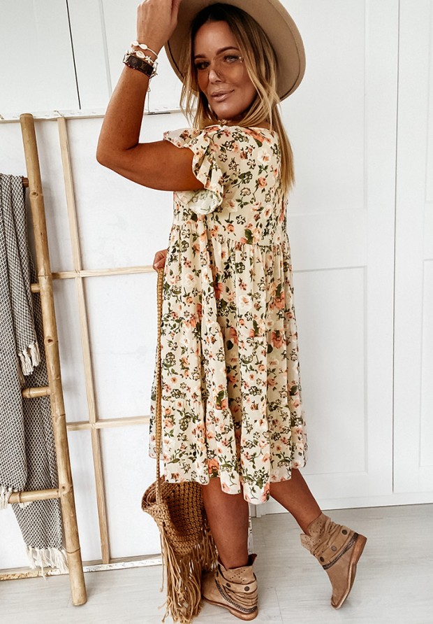A floral dress made of airy fabric is a great choice for spring-summer styling. The model is distinguished by sleeves with a delicate frill and horizontal stitching. Slightly flared hem gives the whole a girlish look. It will perfectly present itself in styling with boots, as well as sandals. Available in several color versions.