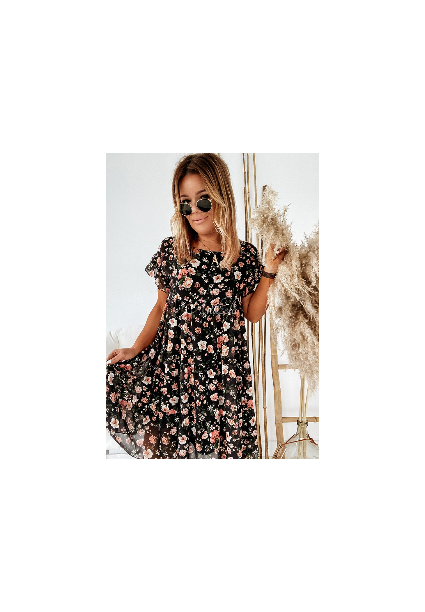 A floral dress made of airy fabric is a great choice for spring-summer styling. The model is distinguished by sleeves with a delicate frill and horizontal stitching. Slightly flared hem gives the whole a girlish look. It will perfectly present itself in styling with boots, as well as sandals. Available in several color versions.
