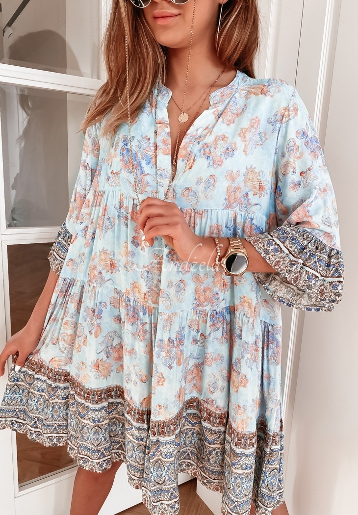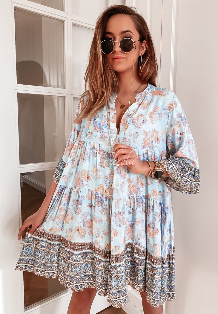A flowing dress distinguished by its original pattern and delicate neckline. The model has horizontal stitching, creating a delicate frill. The 3/4 length sleeves are finished with a flared fabric. This product will be perfect for spring-summer styling, matched with boots or sandals.