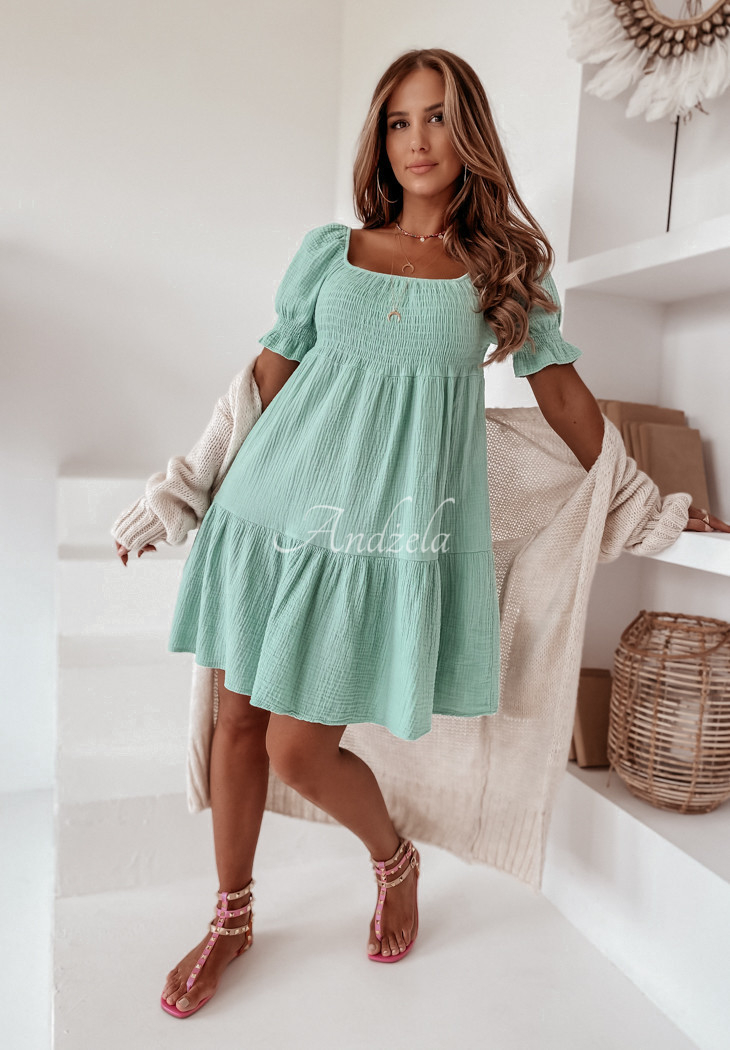 Girlish dress, made of muslin fabric, perfect for summer. The model with an elastic crease in the upper part and elastic in the neckline, thanks to which it adapts to the figure. The bottom and short sleeves are finished with frills, giving the whole thing lightness. This proposal is a perfect choice for everyday looks on hot days. This high-quality product is available in several color variants.