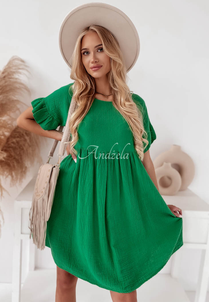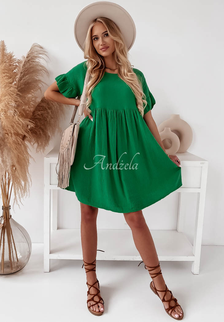 This extremely feminine dress made of high-quality muslin fabric is the perfect choice for hot summer days. The model has short sleeves finished with a delicate frill. The dress has a cut under the bust, which will perfectly emphasize and highlight your waist. Pair it with sandals or sneakers. Available in many colors.