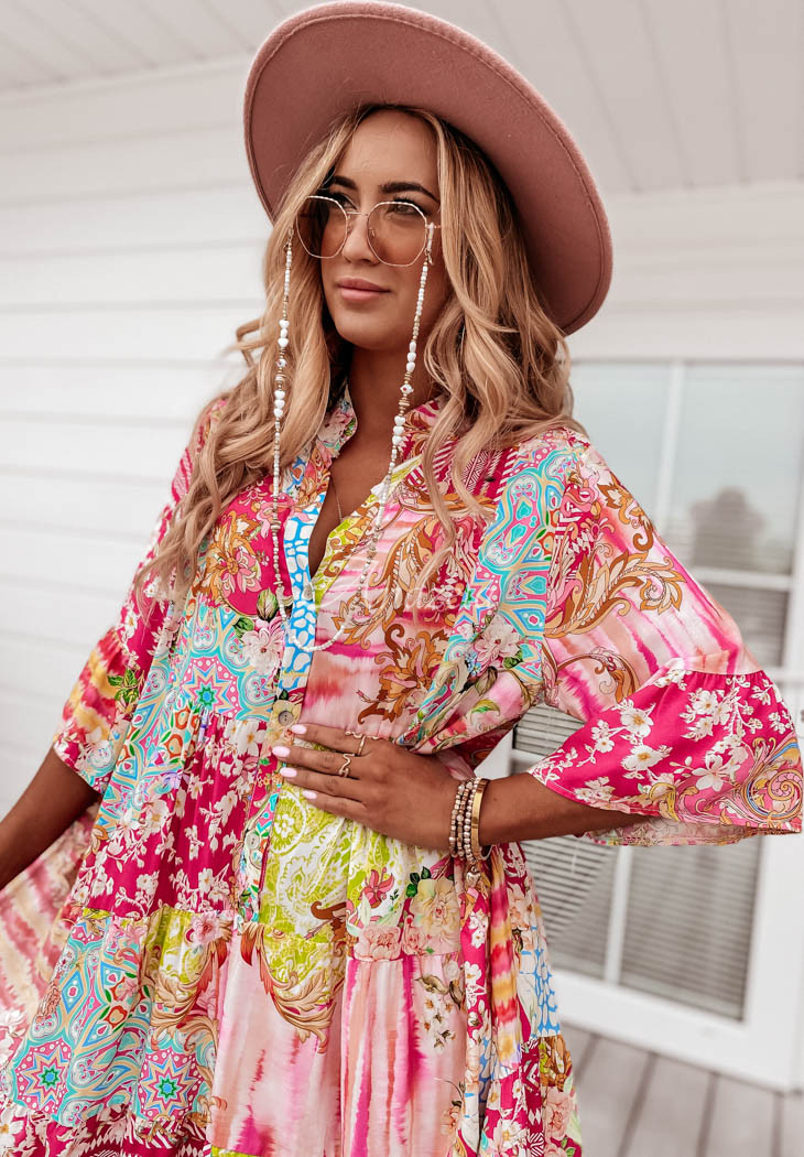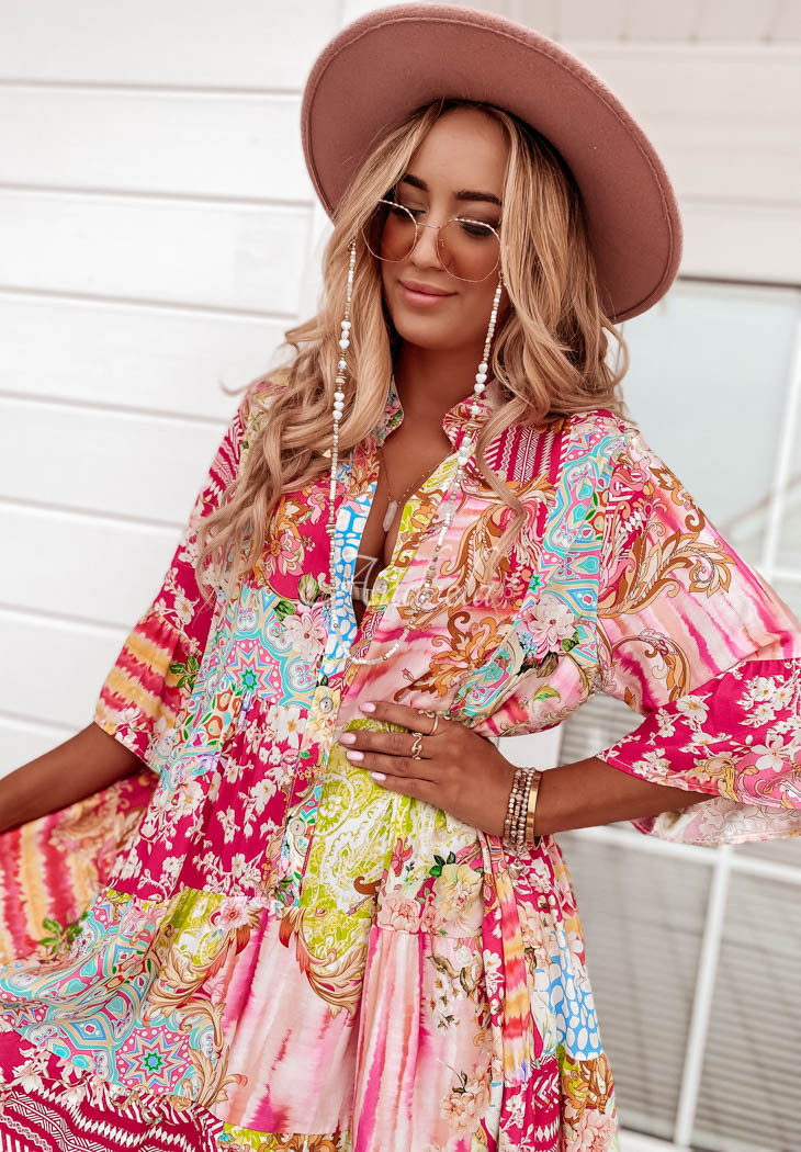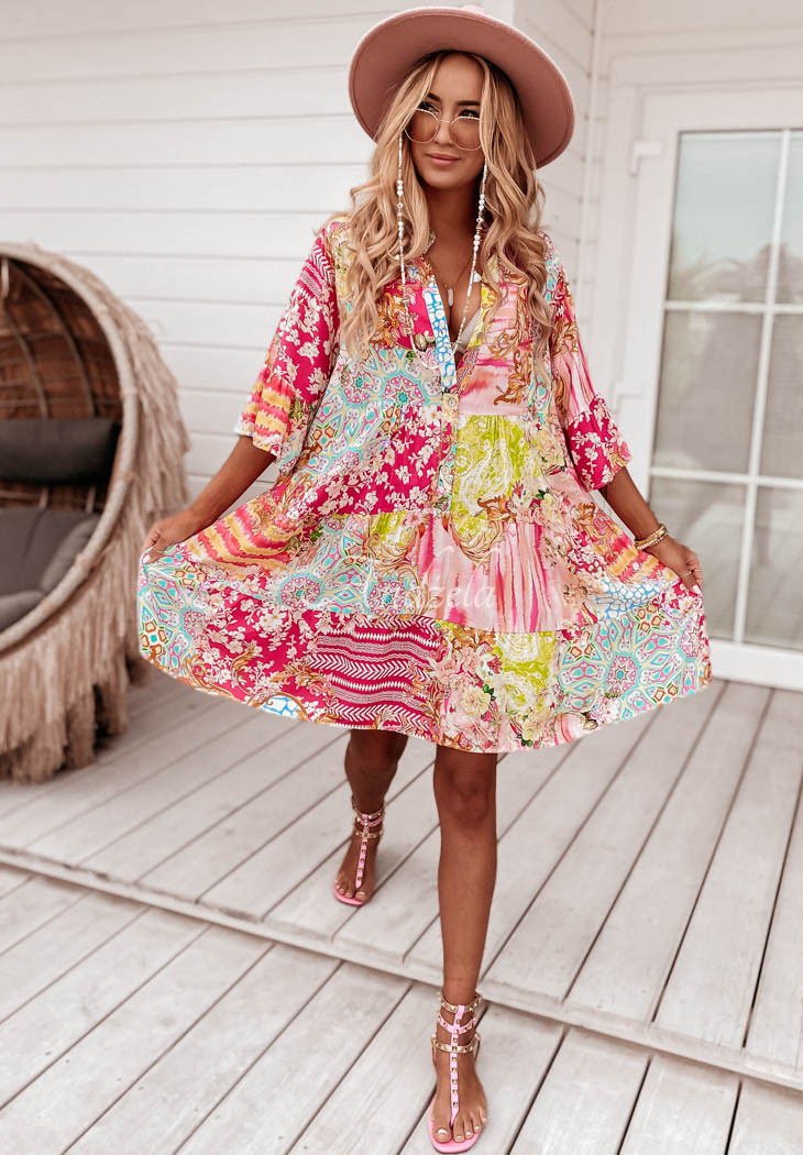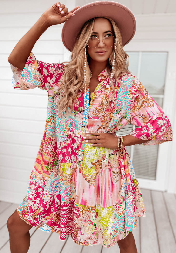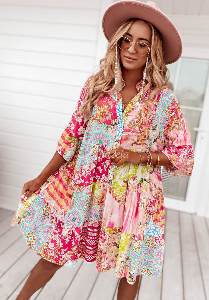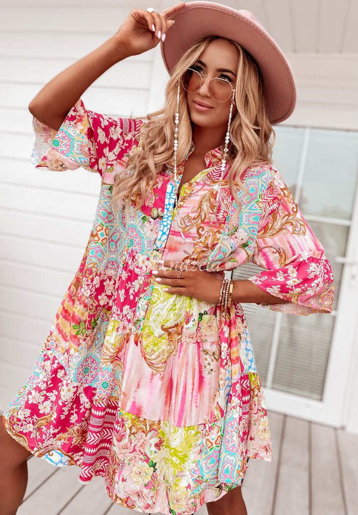 Dress made of patterned fabric is an accomplished choice for composing many unique looks. The button-down model features 3/4-length sleeves distinguished by a flared fabric. The dress also has decorative stitching located at the bottom, which creates delicate ruffles. Available in a variety of patterns and colors.