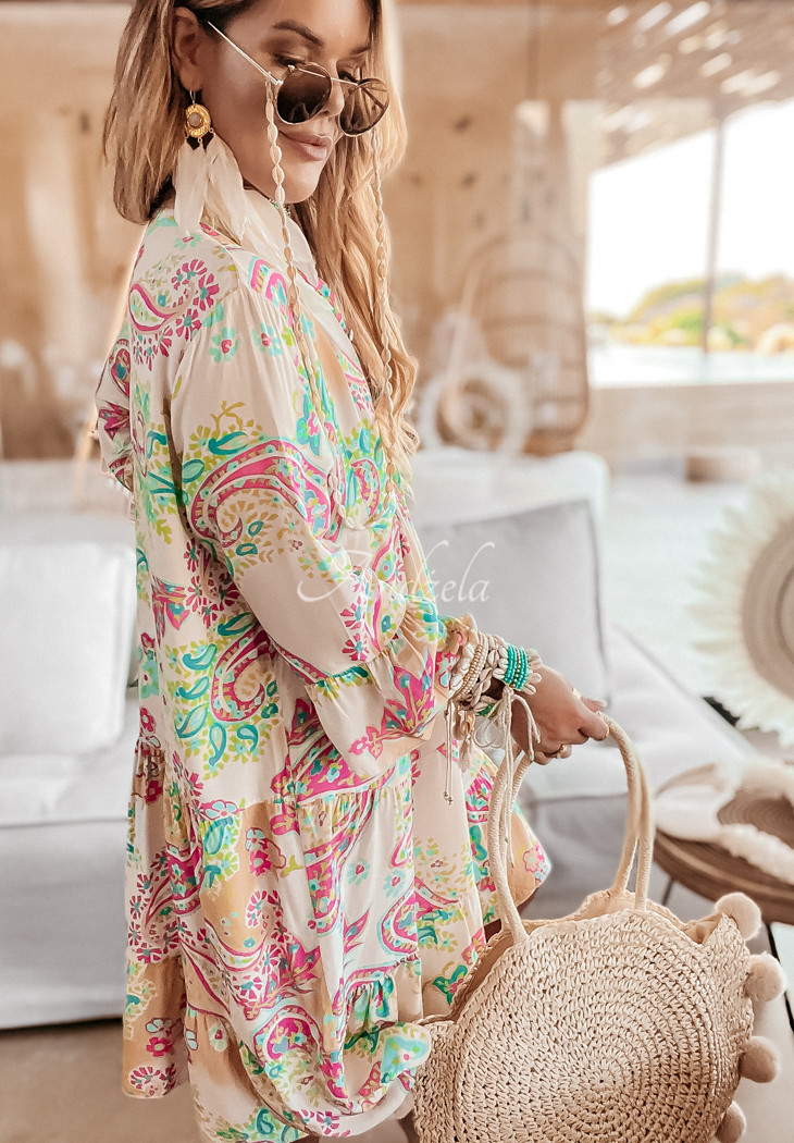 This uniquely patterned dress is a great base for airy everyday looks. It is buttoned, has 3/4 length sleeves, which, like the hem, are finished with a frill. The oversize cut will work fantastically on different body types. The product is made of high-quality material, and is available in several patterns.