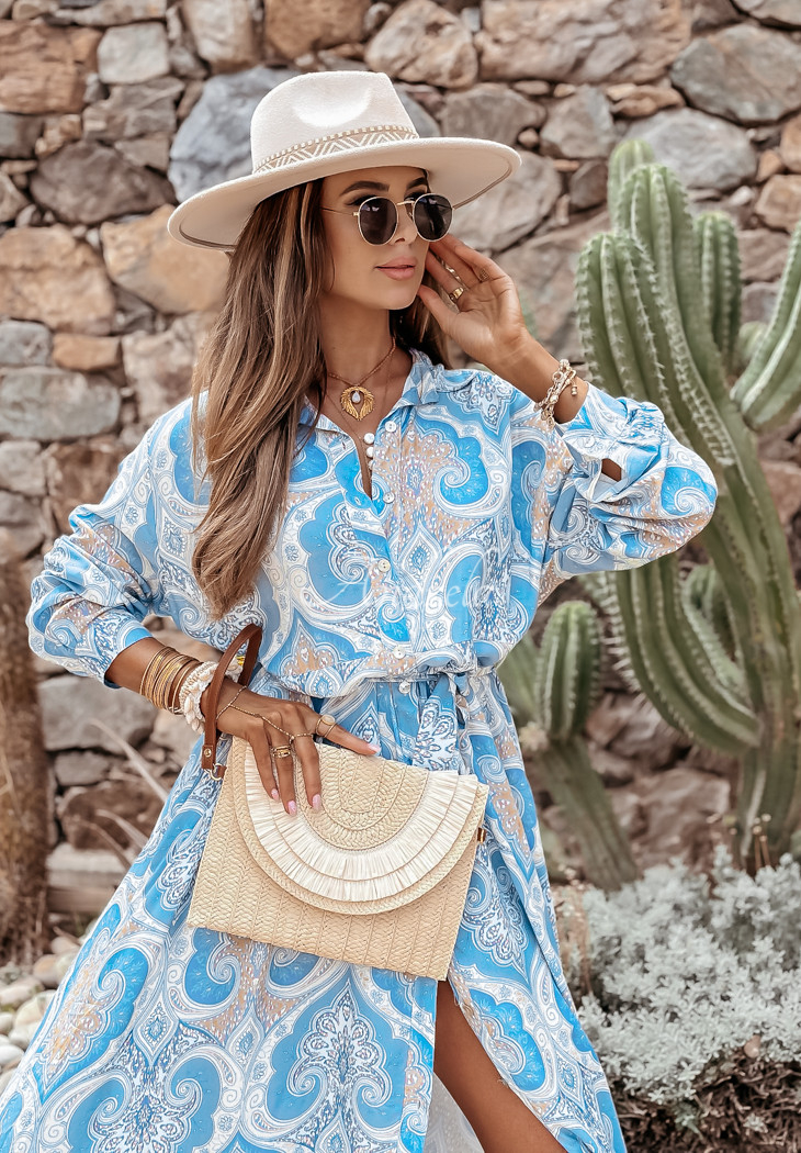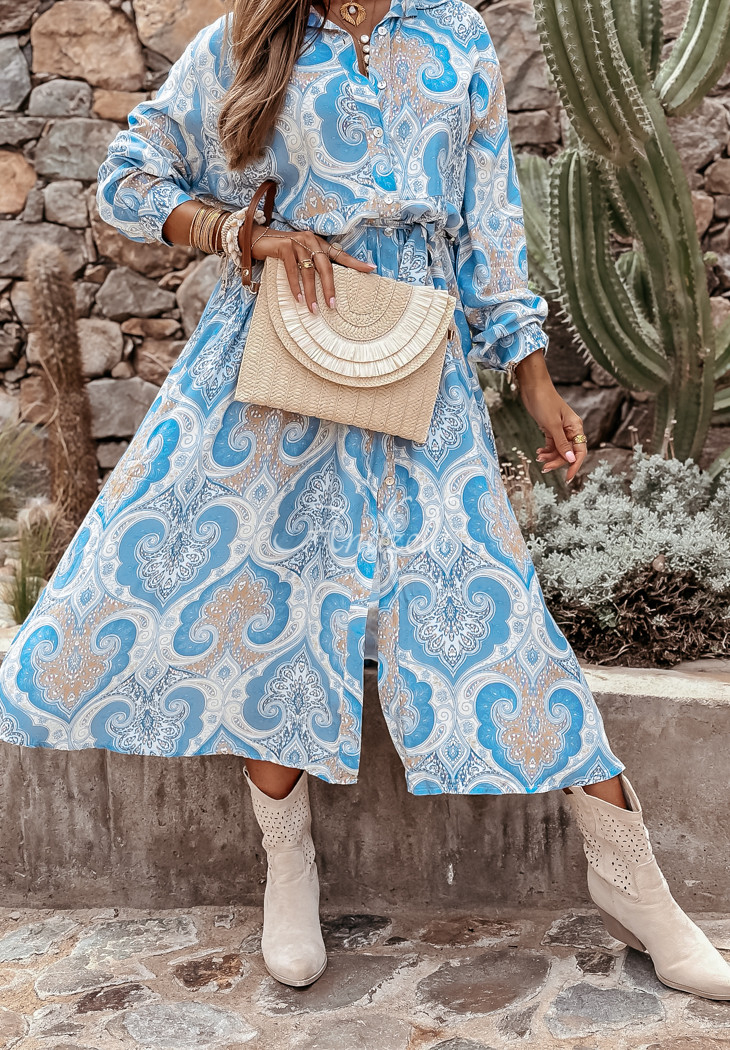 A viscose midi length dress with unique patterns is a proposal that will be perfect for both casual and special occasion styling. The oversized cut model is buttoned and has pockets on the sides. It comes with a belt, perfect for accentuating feminine assets.