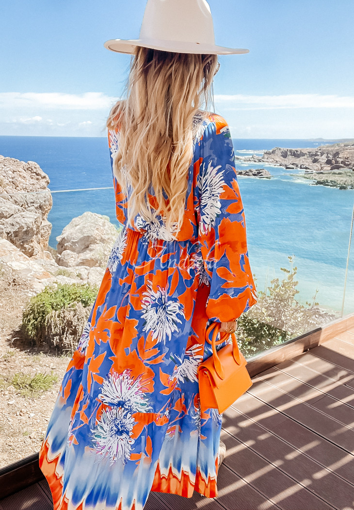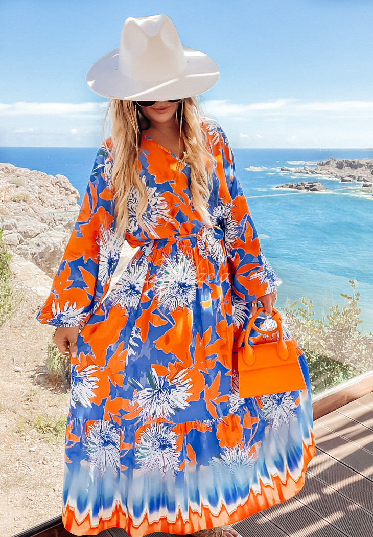 Viscose maxi length dress with unique patterns. It is an oversized model with an elastic waistband and long sleeves with ribbed cuffs. The front features a cut-out heart neckline, and the hem is finished with a girly ruffle. It comes with a fabric belt that will accentuate the silhouette and add interest to any look.