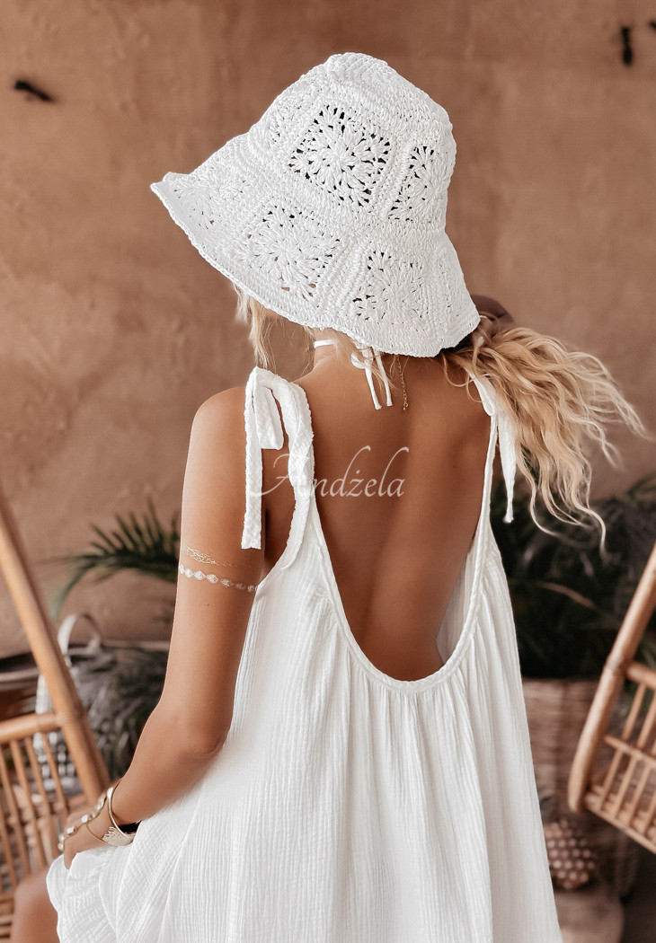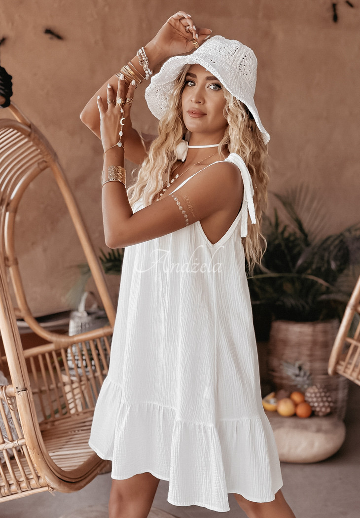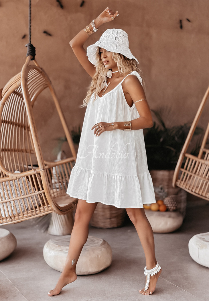 Cotton dress made of lightweight muslin fabric, perfect for summer days. It is an oversized model on tied straps with an extremely feminine cut-out neckline located both in the front and back. The bottom was finished with a girlish ruffle. Compose your dream look by choosing from other proposals from the Aloha Beaches series. Design by ANDŻELA!