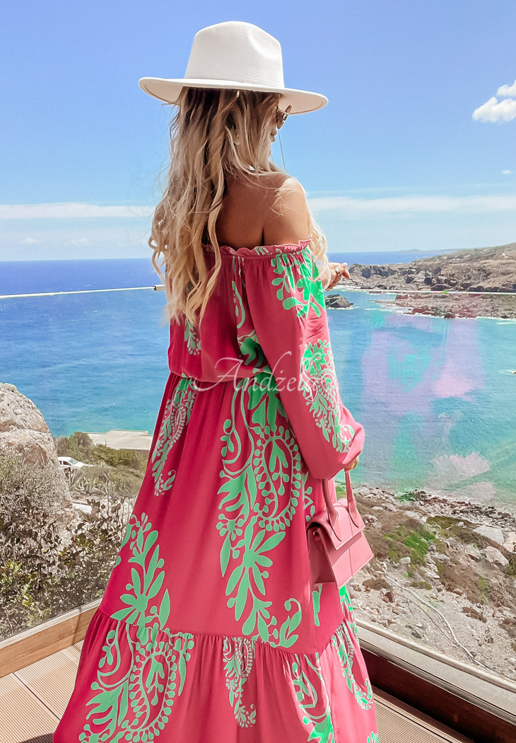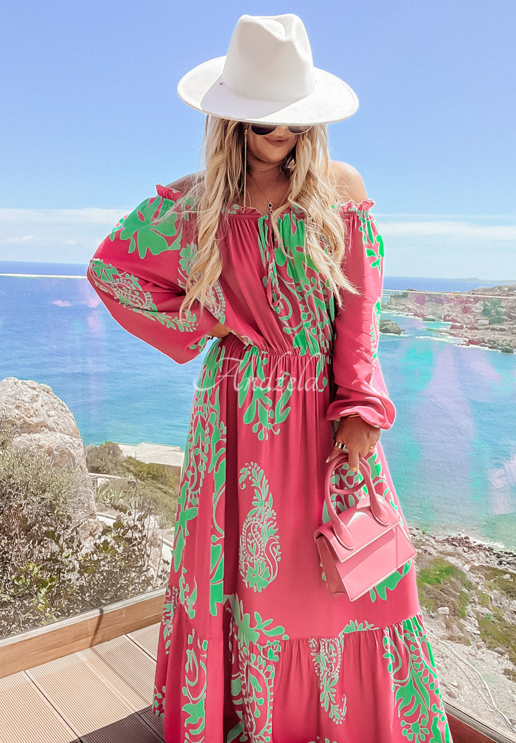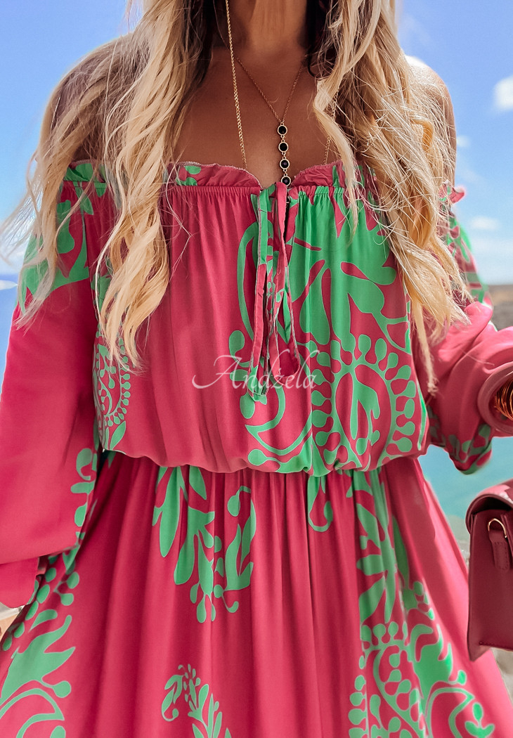 Viscose dress with unique patterns is a great choice for everyday wear in the summer season. It is incredibly light and airy, the charm is added by girlish ruffles. It is a model with long sleeves, it also has an elastic at the neckline as well as the waist, so it fits perfectly to the figure.