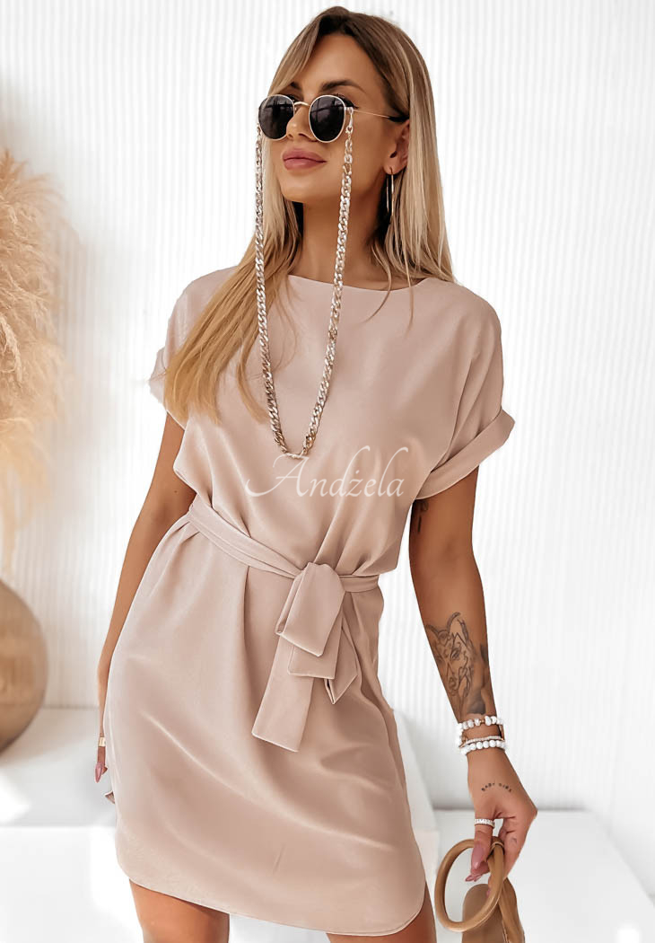 Minimalist dress with trapeze cut is a perfect choice for various occasions. It's a model with a round neckline and short, fixed rolled sleeves. It comes with a fabric belt, which will do a great job of accentuating the assets of your figure.