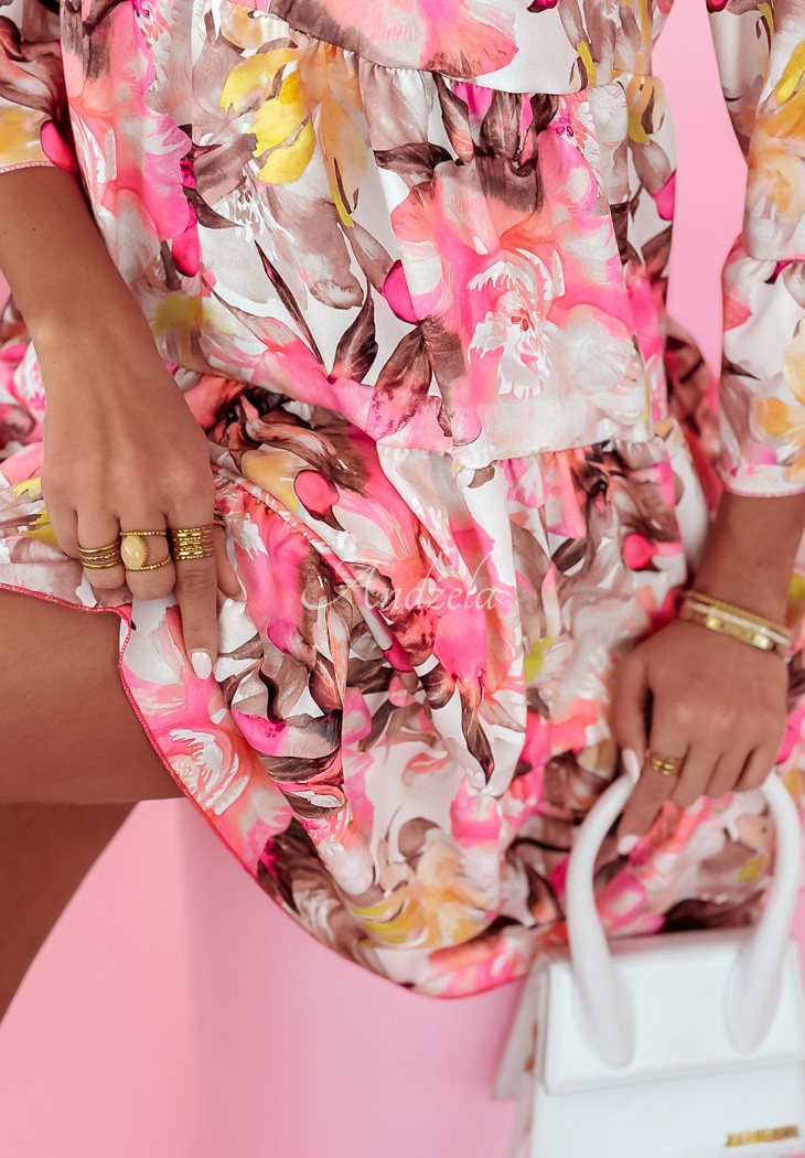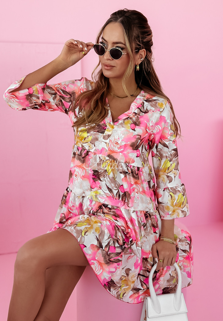 A lightweight dress with unique patterns is a perfect choice for girly looks. It is distinguished by airy ruffles, giving it charm. It is a model with 3/4-length sleeves and a sweetheart neckline.