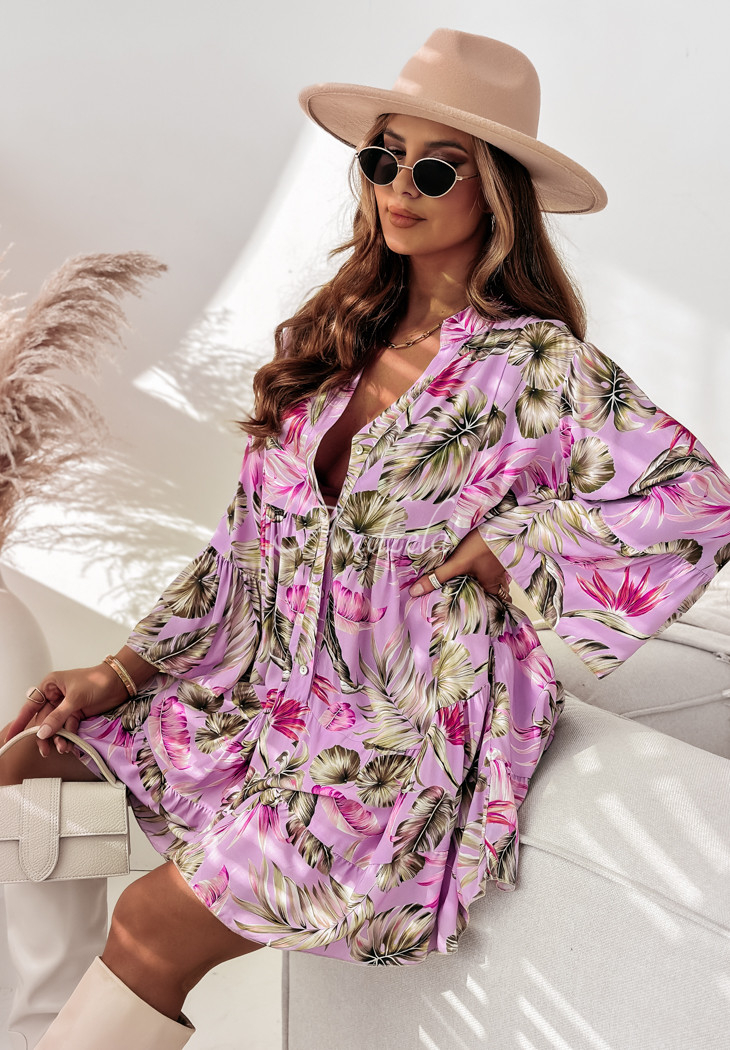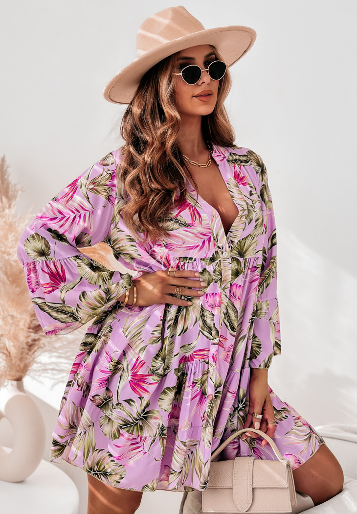 A patterned dress made of high-quality viscose material is a perfect option for girly looks. It's an oversized cut model with a v-neck and button closure. It has long sleeves, as well as airy ruffles, which add lightness to the overall look.