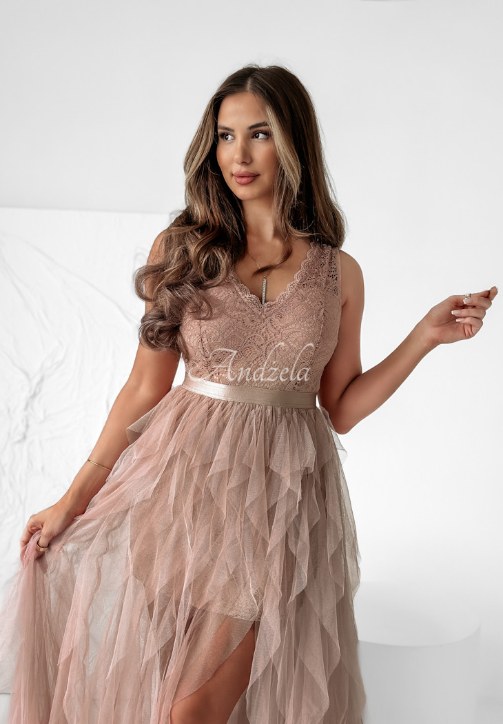 A long dress made from a combination of lace fabric and asymmetrically cut tulle fabric. The model with a deeper neckline in the front and back has wider straps. An additional asset is the elastic waistband, which will emphasize and highlight your figure.