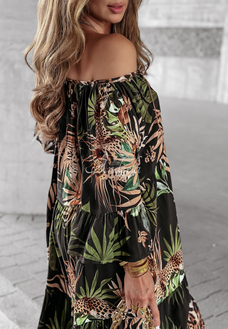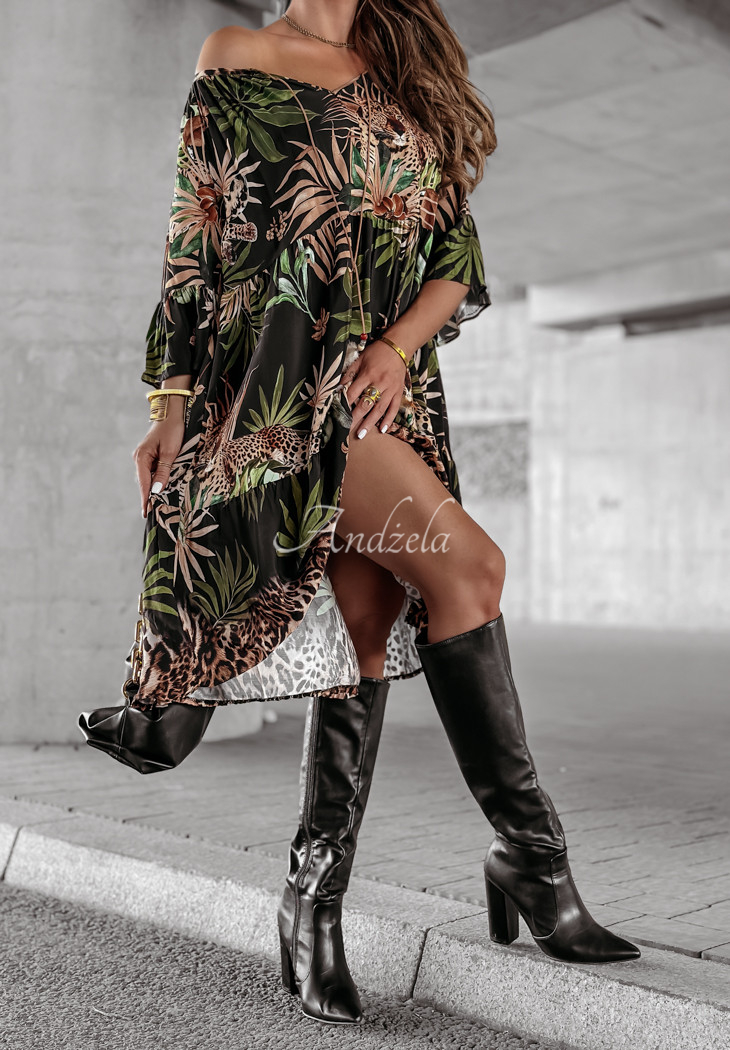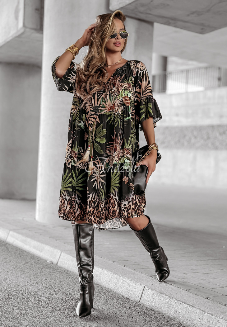 Oversized dress made of airy viscose fabric is a perfect choice for everyday looks. The model with binding at the neckline has short sleeves, which are finished with a frill. Available in two patterns and color versions.