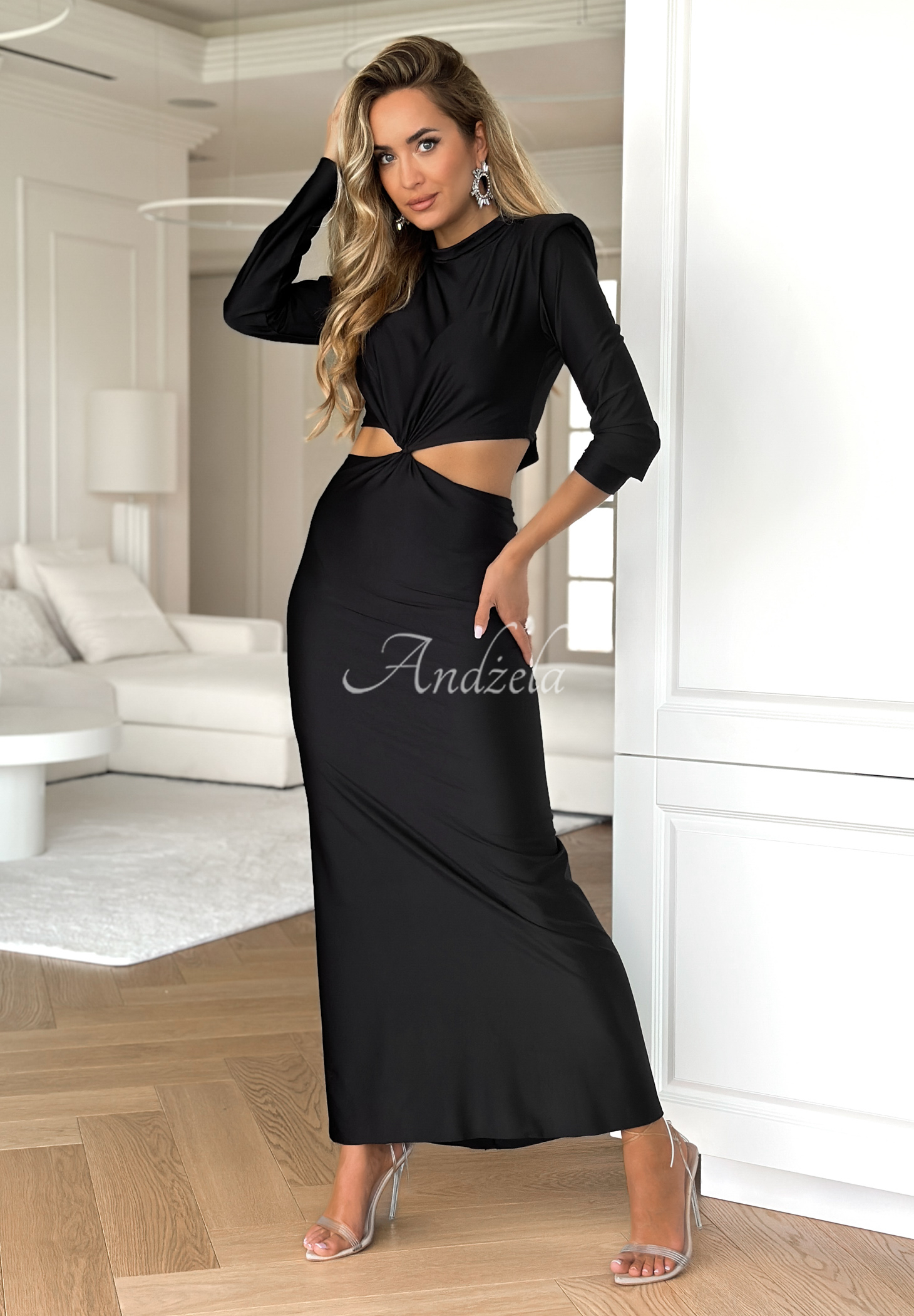 A maxi length dress made of smooth, pleasant-to-touch fabric. It is distinguished by shoulder pads and a cut-out at the waist. It is a fitted model with a stand-up collar, has an open back and a subtle binding at the back.