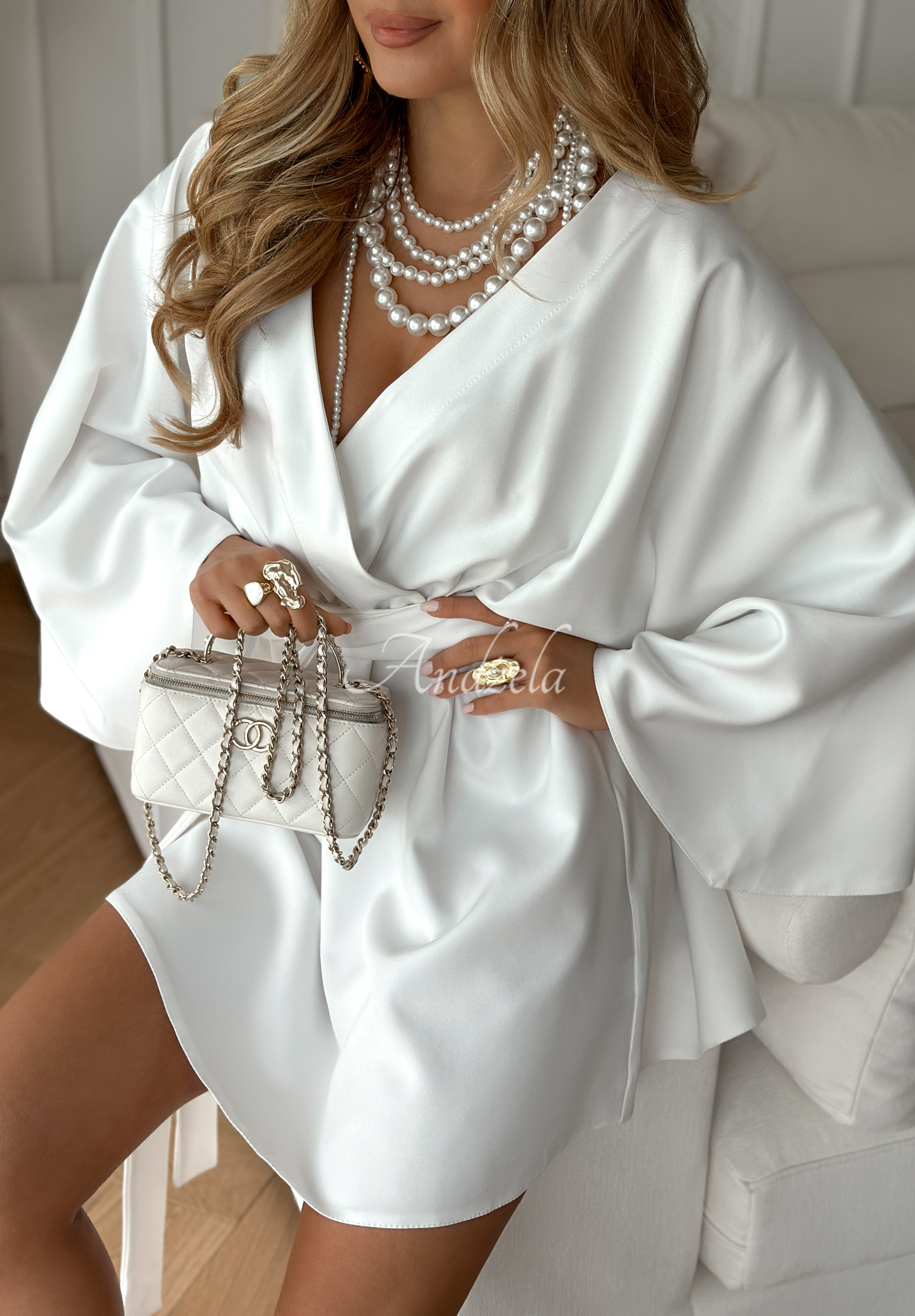 Elegant dress made of smooth and pleasant to the touch fabric. It is an oversized bat cut model with wide sleeves. It is distinguished by a deep-cut envelope neckline at the front and back. There is an elastic waistband, and a fabric belt is also included. Design by ANDŻELA!