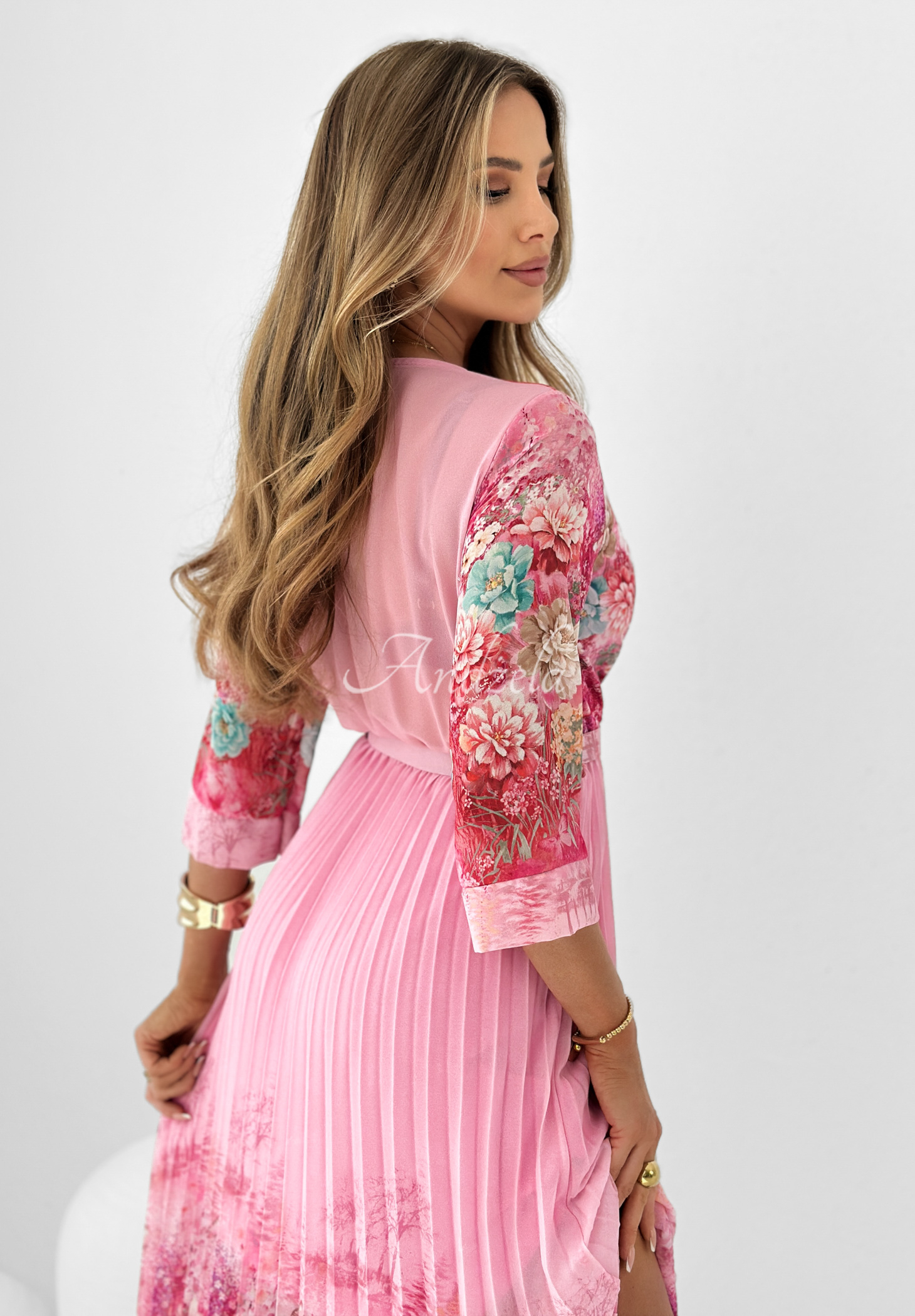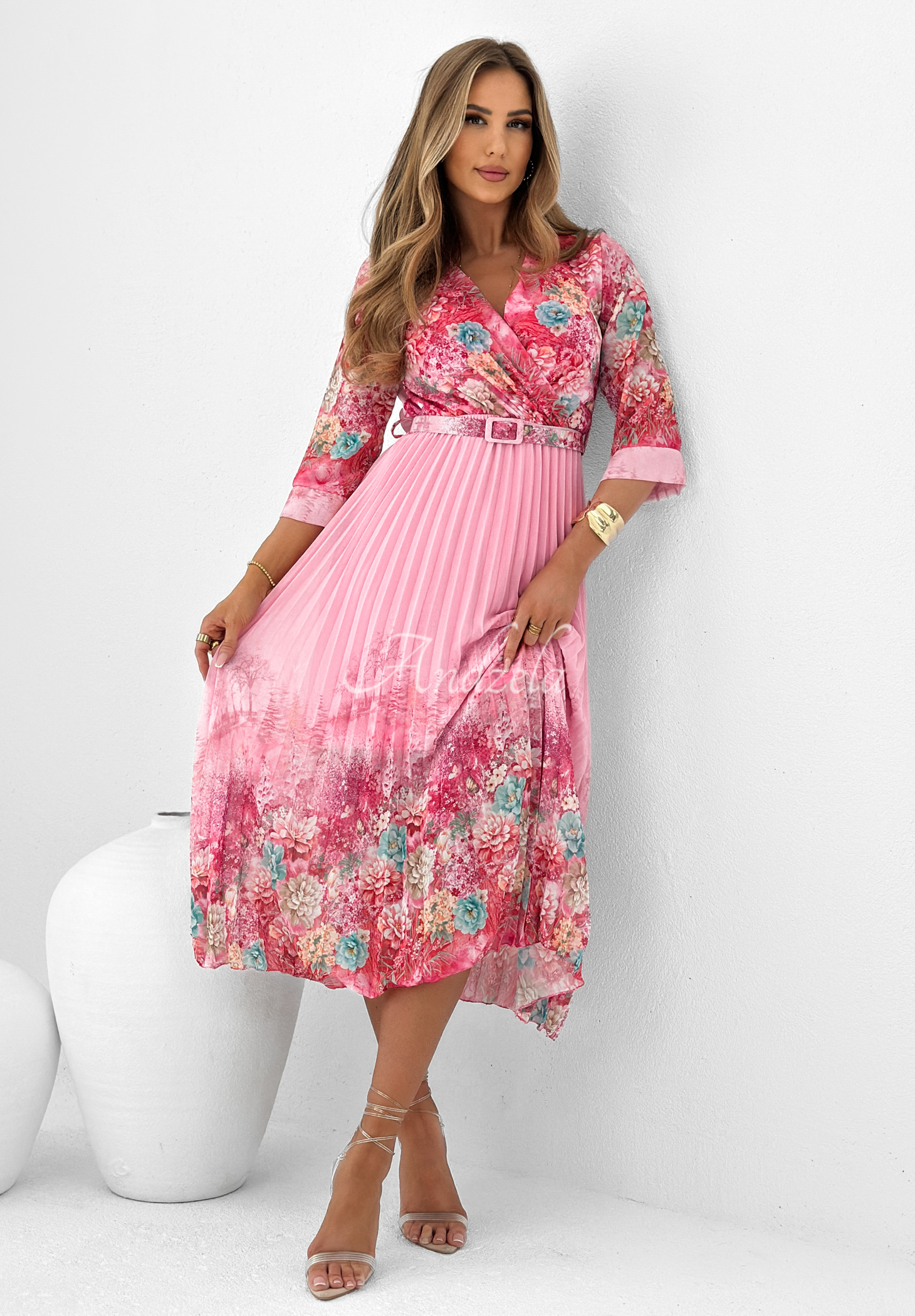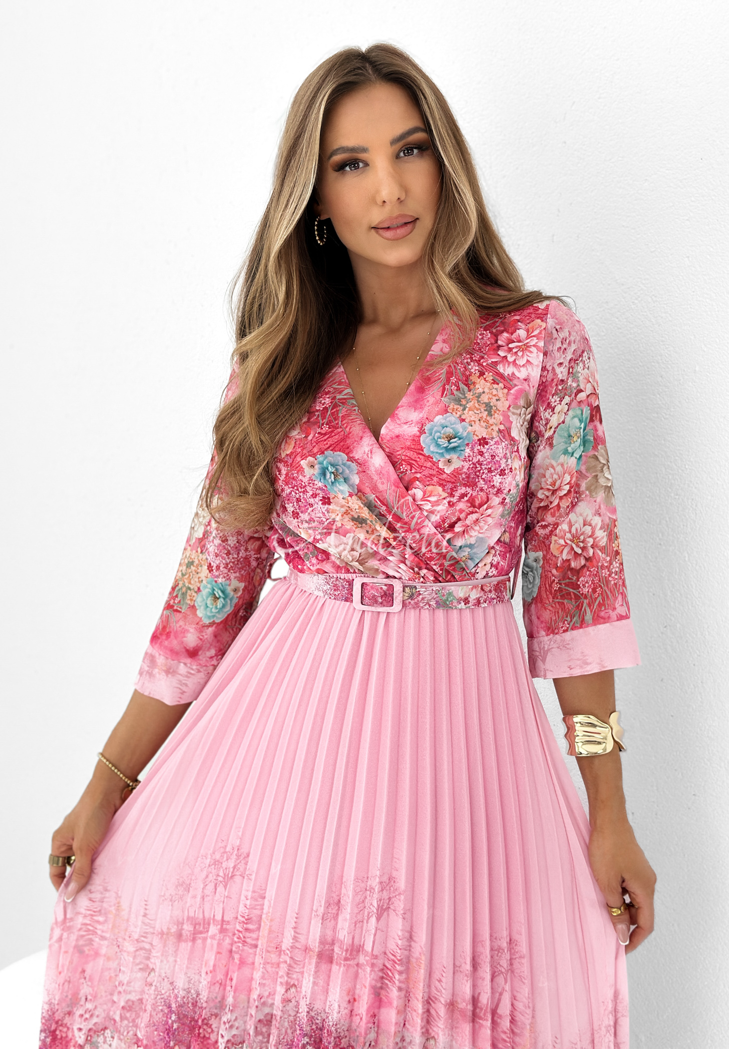 Floral dress, distinguished by a pleated bottom, made of pleasant to the touch, lightweight fabric. It is a proposal with an overlap neckline and transparent sleeves. The maxi length model has a lining. The whole is complemented by a belt included in the set.