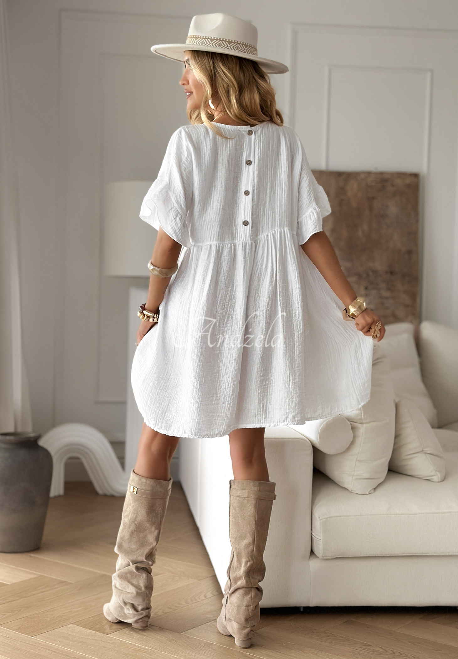 A lightweight, airy dress made of high-quality fabric. It is an oversized model, which has a rounded neckline and a button closure at the back. The sleeves and hem are decorated with fashionable ruffles.