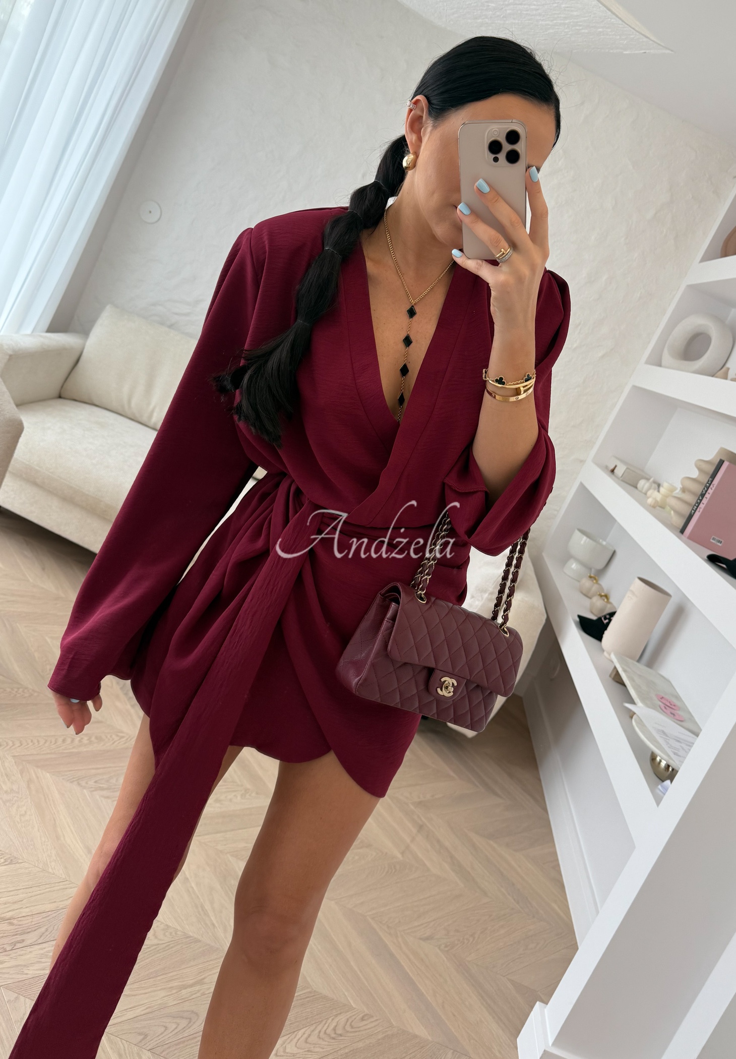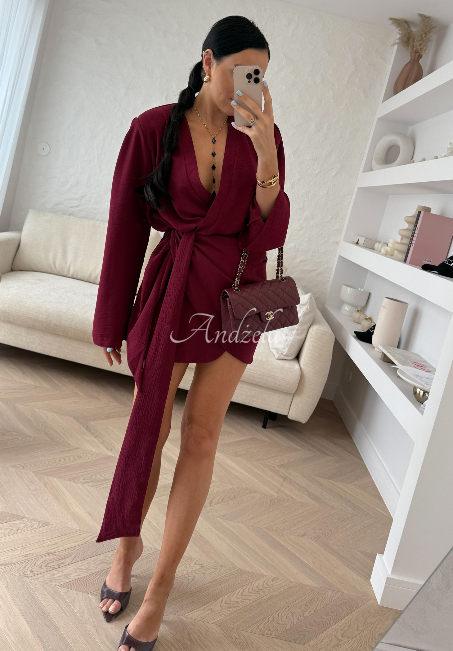 Exceptional mini dress made of high-quality linen fabric. This model is distinguished by an envelope neckline and overlap binding. Product with elastic waistband and long, wide-finished sleeves.