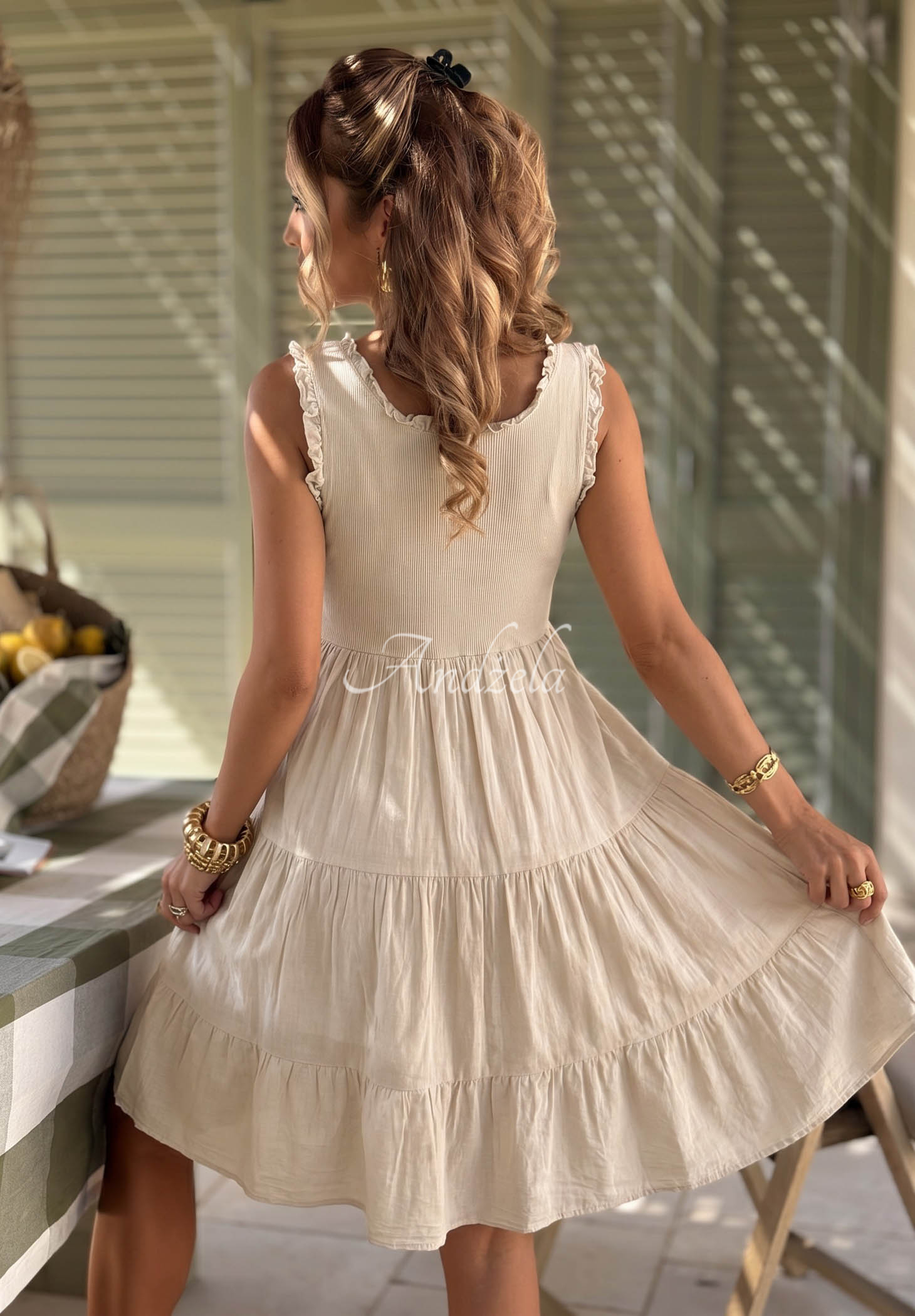 A dress with a ribbed top, made of cotton fabric. This design stands out with its airy ruffles, a rounded neckline, and a lining.