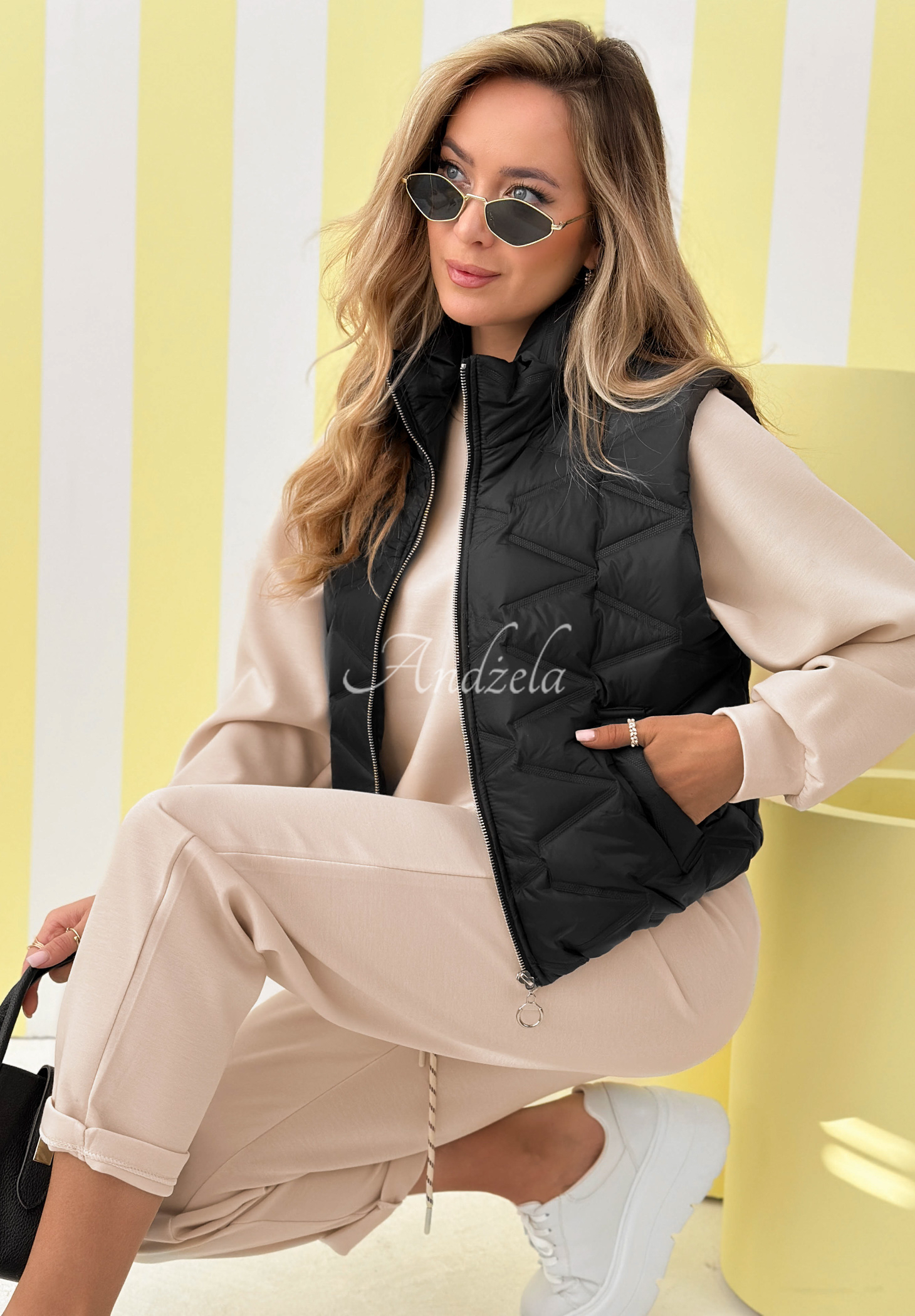 A short quilted vest with a stand-up collar. The model has a zipper closure and functional pockets.