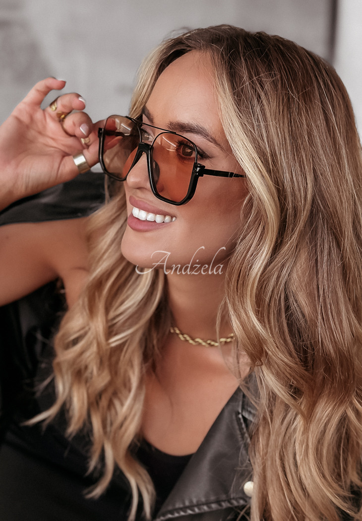 Fashionable sunglasses are the perfect accessory to add character to any outfit. They feature large, square glasses in a warm shade of brown, which provide protection from the sun while accentuating the face. Solid black frames give the glasses an elegant look, while thin temples add a modern touch.