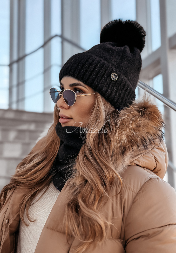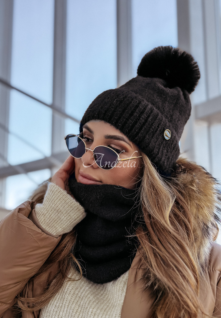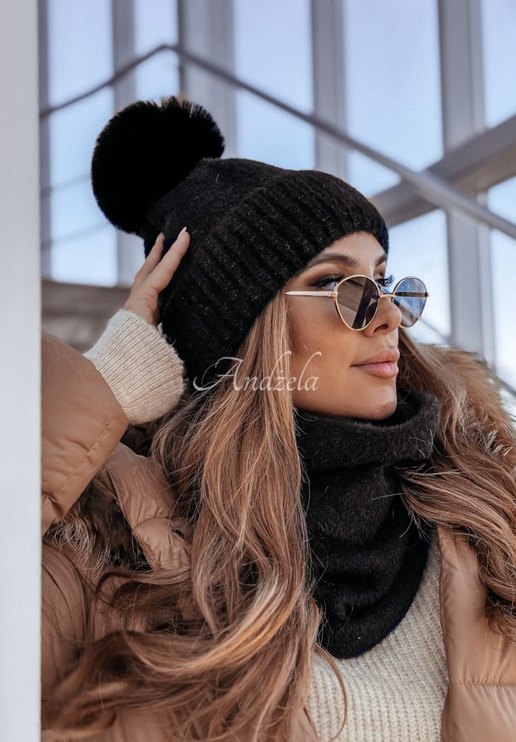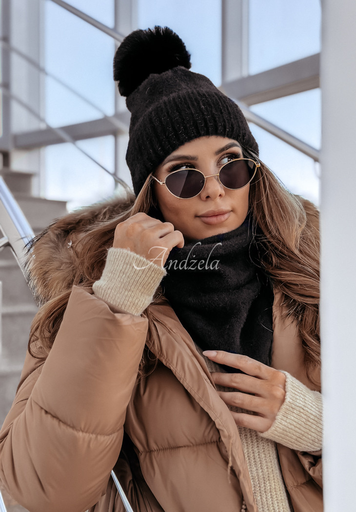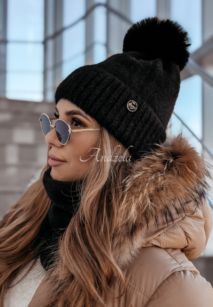 A soft beanie made of extremely pleasant to the touch material is a great addition to looks for cold days. It is distinguished by a charming pompon made of synthetic fur and stitching with gold thread. There is a small patch on the front.