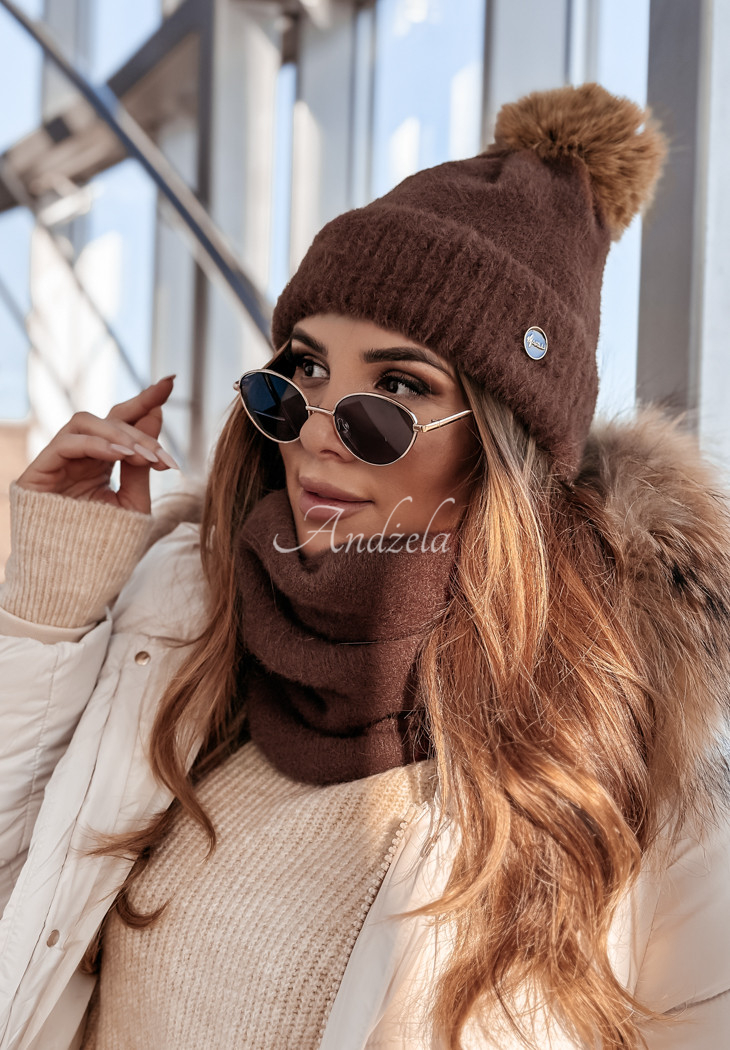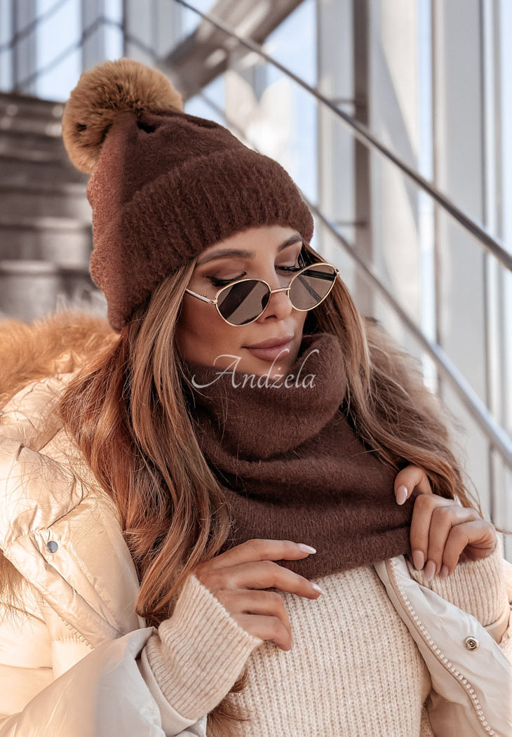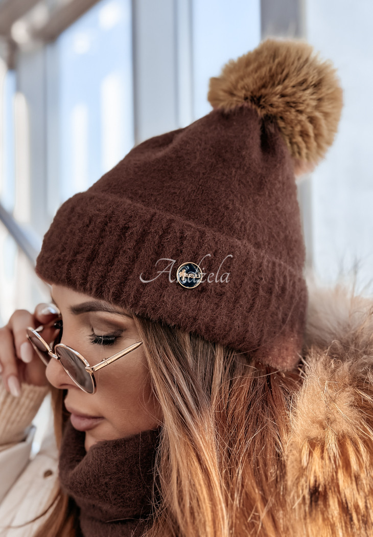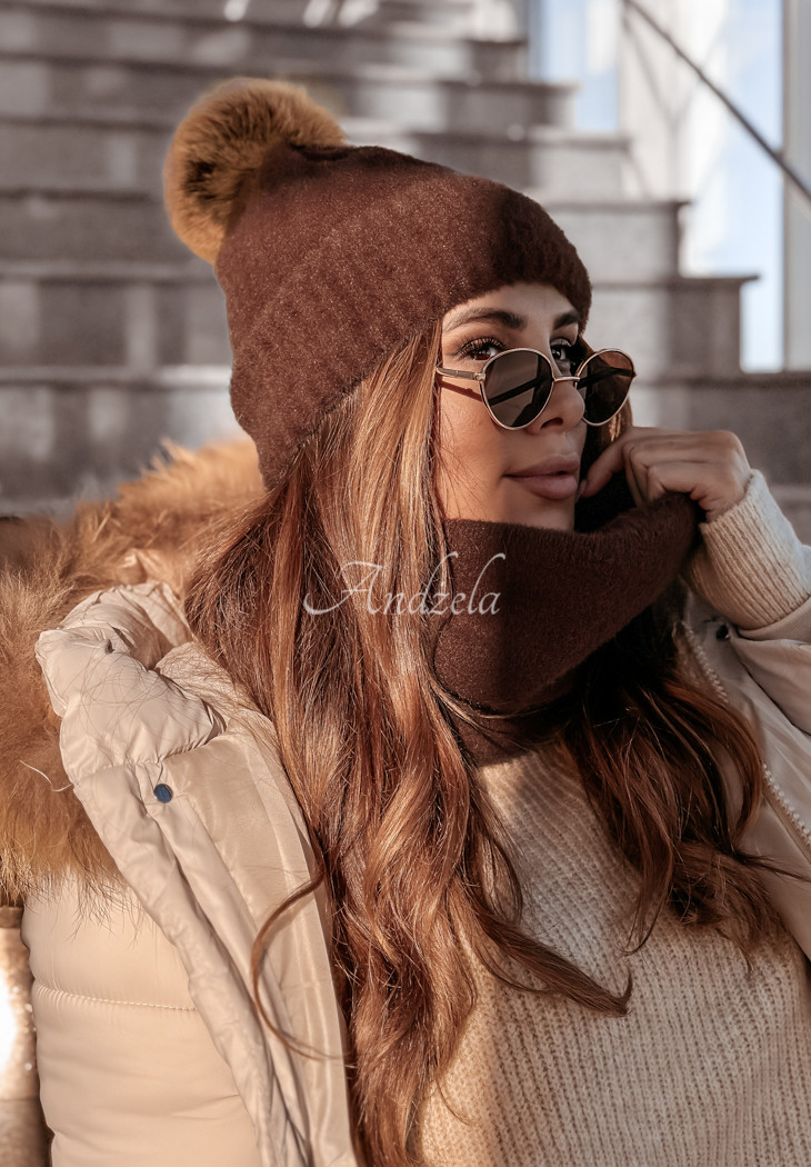 A soft beanie made of extremely pleasant to the touch material is a great addition to looks for cold days. It is distinguished by a charming pompon made of synthetic fur and stitching with gold thread. There is a small patch on the front.