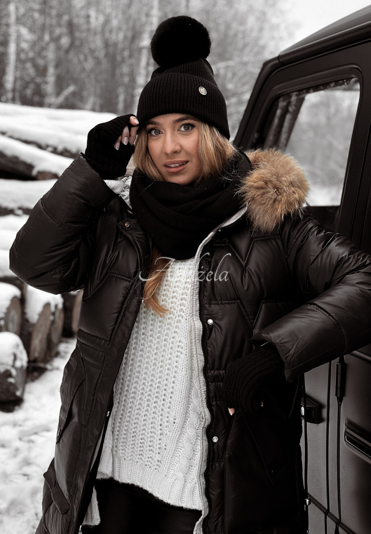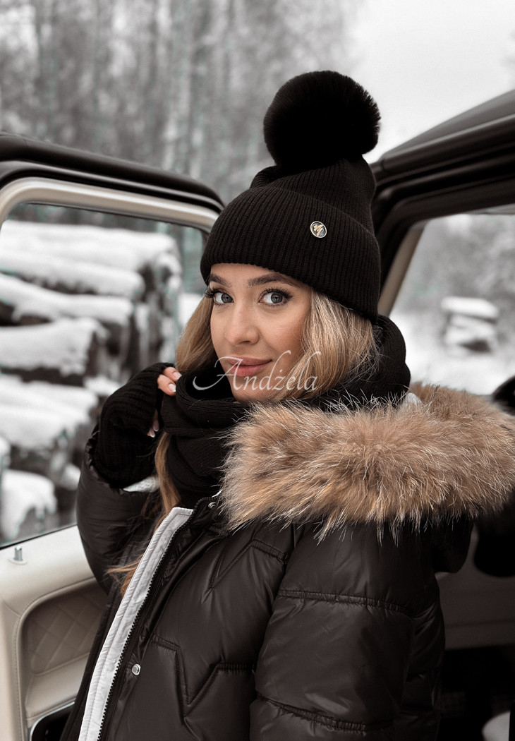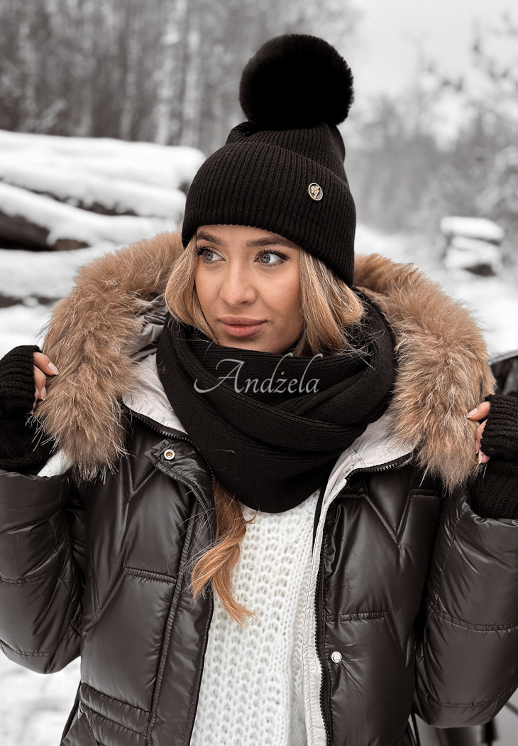 A ribbed cap distinguished by an adorable pom-pom made of synthetic fur. It is a model with a folded bottom and a small decorative patch on the front. It will be perfect for cold days, it will protect you from the cold and at the same time it will look really fashionable.