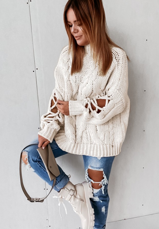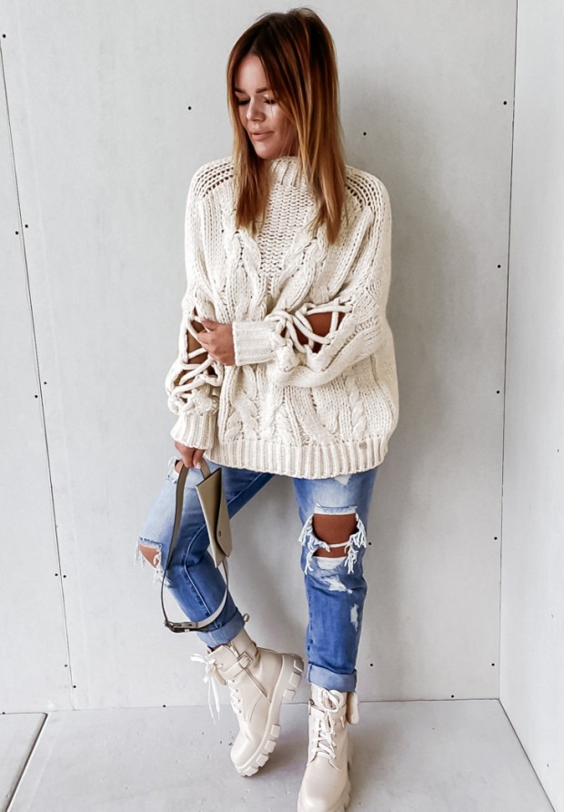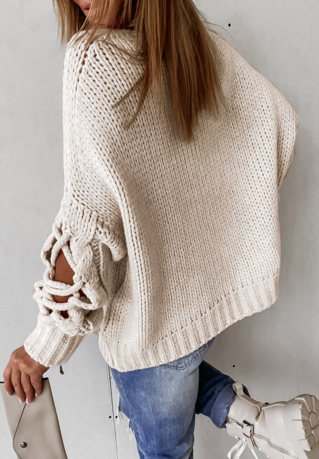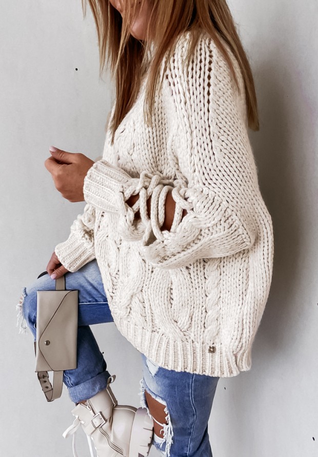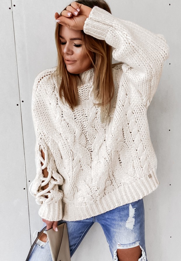 Beautiful sweater with decorative weave is a perfect choice for autumn-winter styling. It is distinguished by original sleeves, which add character to the whole. The oversize cut model has a stand-up collar. It will present itself beautifully in both elegant and sporty styling. The product is available in several color variants.