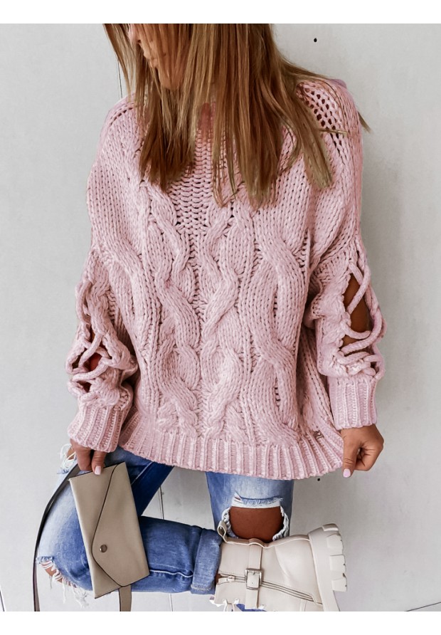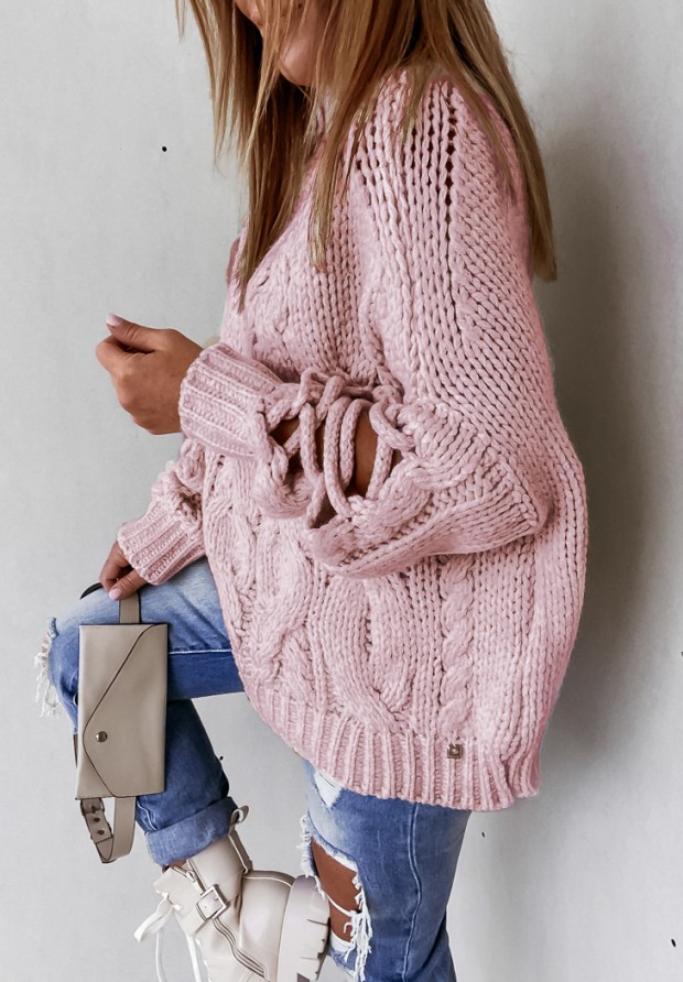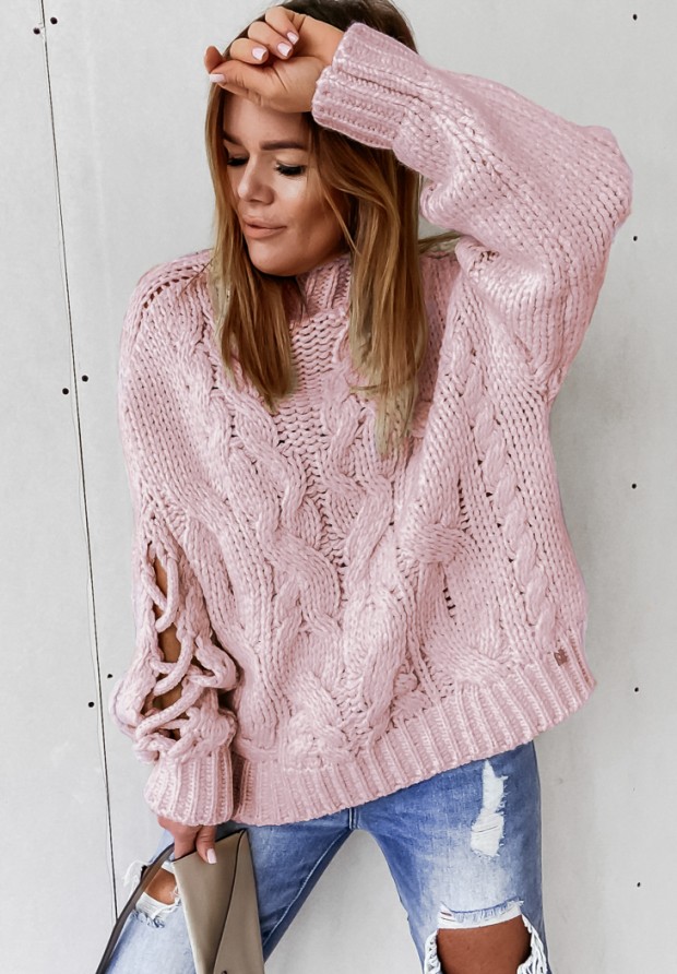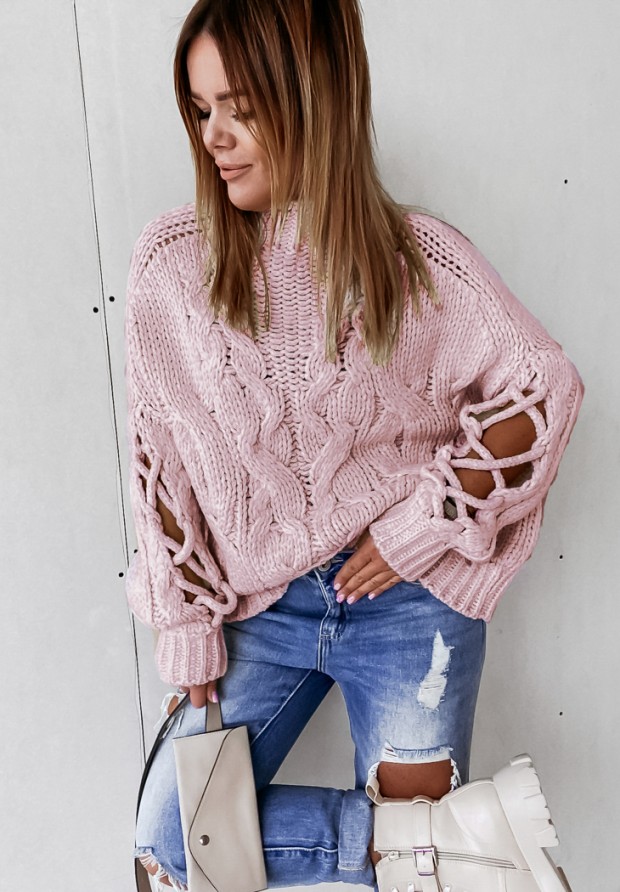 Beautiful sweater with decorative weave is a perfect choice for autumn-winter styling. It is distinguished by original sleeves, which add character to the whole. The oversize cut model has a stand-up collar. It will present itself beautifully in both elegant and sporty styling. The product is available in several color variants.