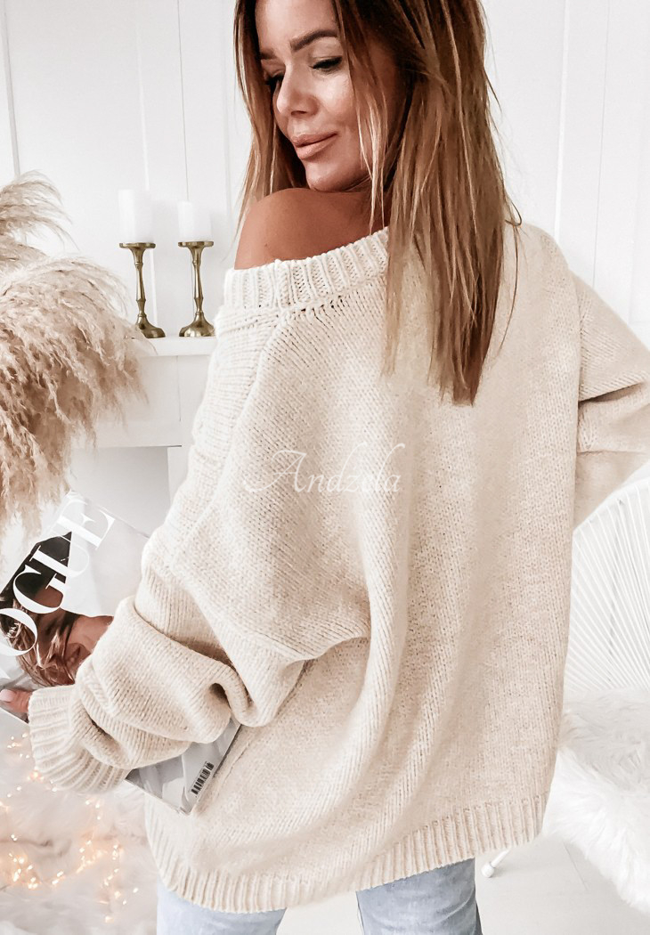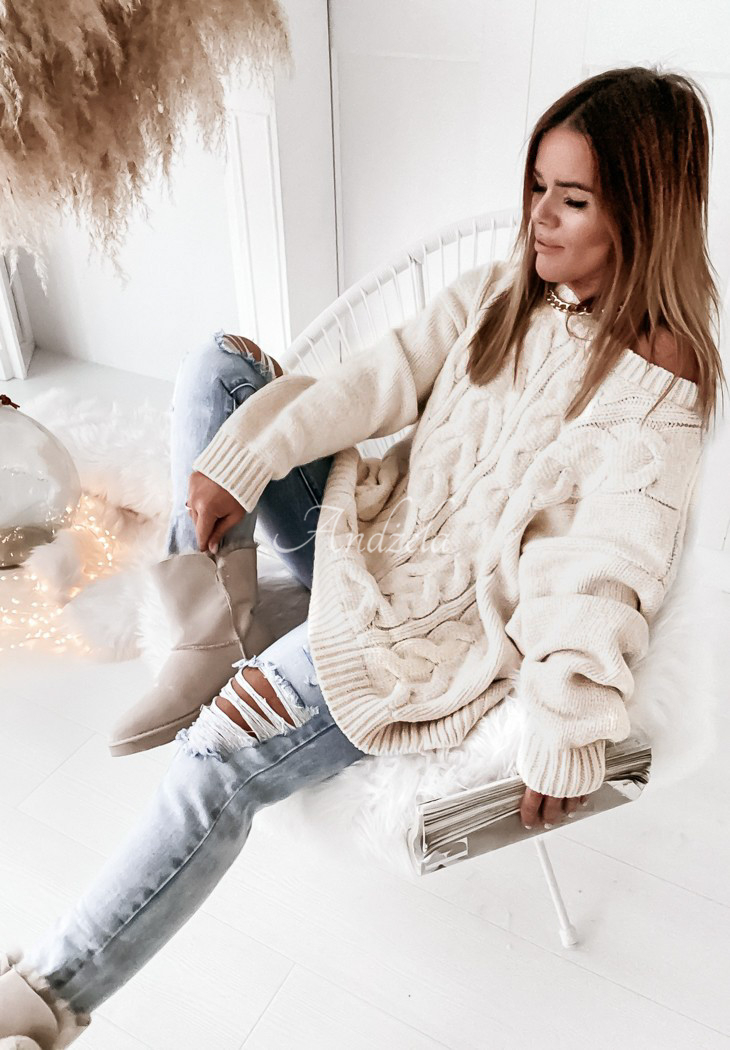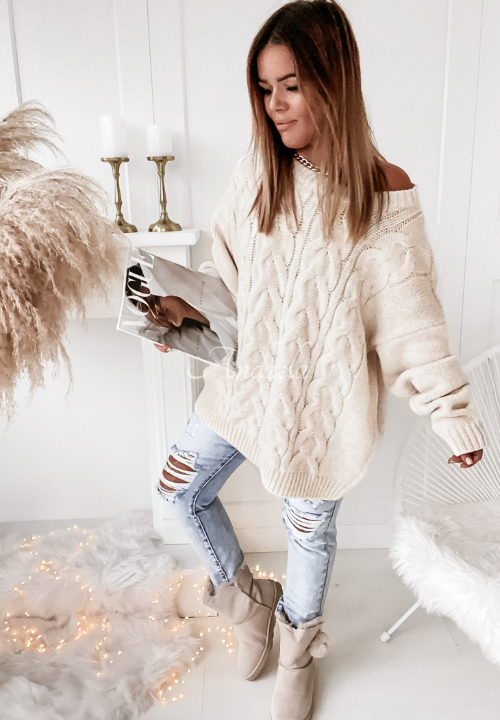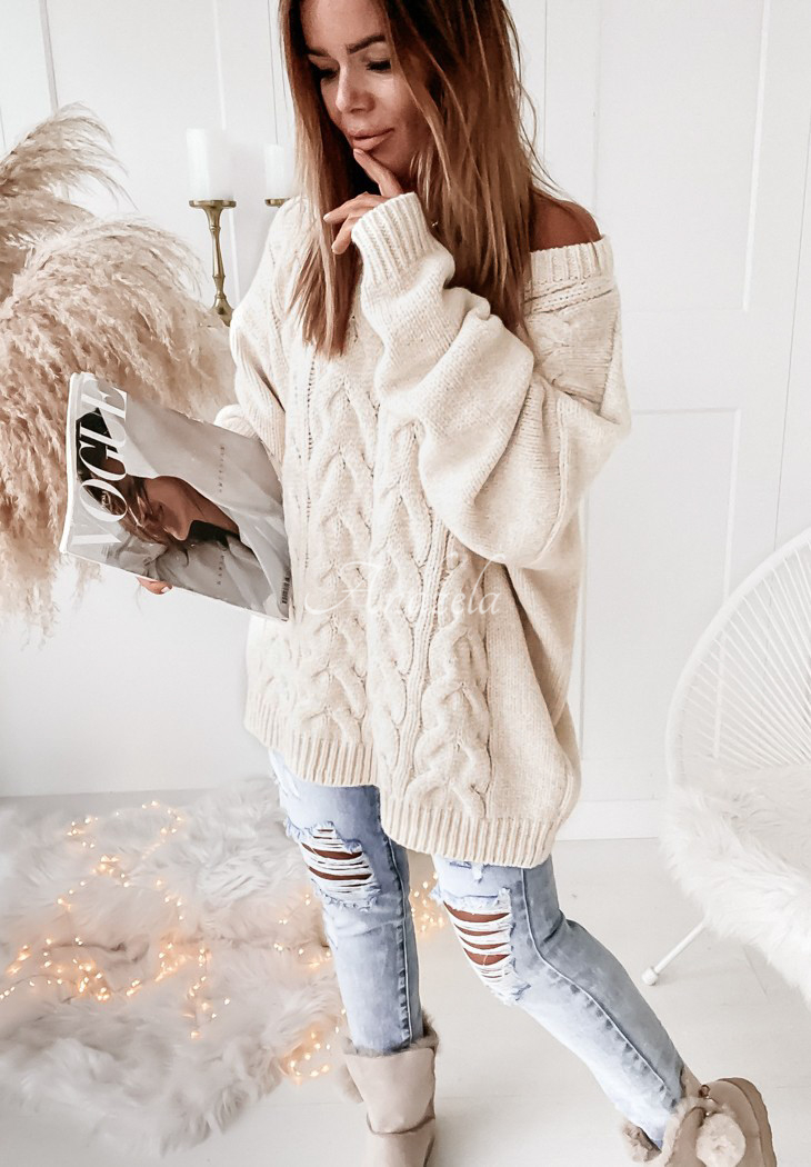 A longer sweater distinguished by its decorative weave is an ideal proposition for cold days. It is an oversized model, has a half-round neckline and welts at the bottom and sleeves. This proposition will present itself perfectly in combination with jeans or leggings.