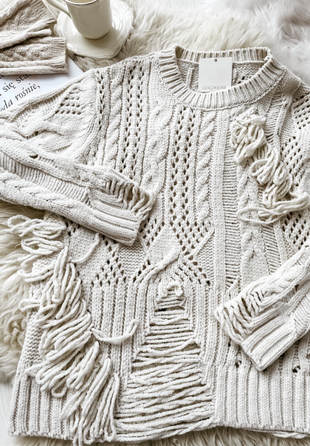 A beautiful sweater with a thick weave. It has a ribbed hem and sleeves and decorative tassels on the front. Very warm and nice to the touch. It will add originality to any of your styling!