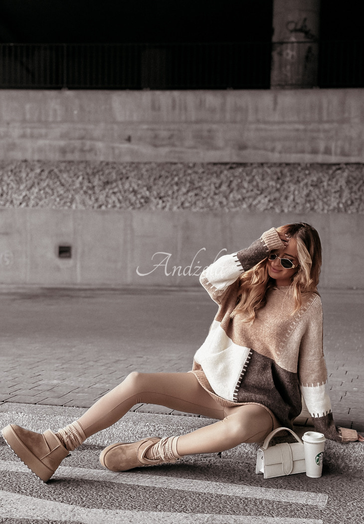 A loose pullover with a hood, sewn from a soft, tactile knit is a MUST HAVE in every closet. The sleeves are finished with ribbed cuffs, and there are pockets on the front. It is a perfect choice for everyday styling on cold days.
