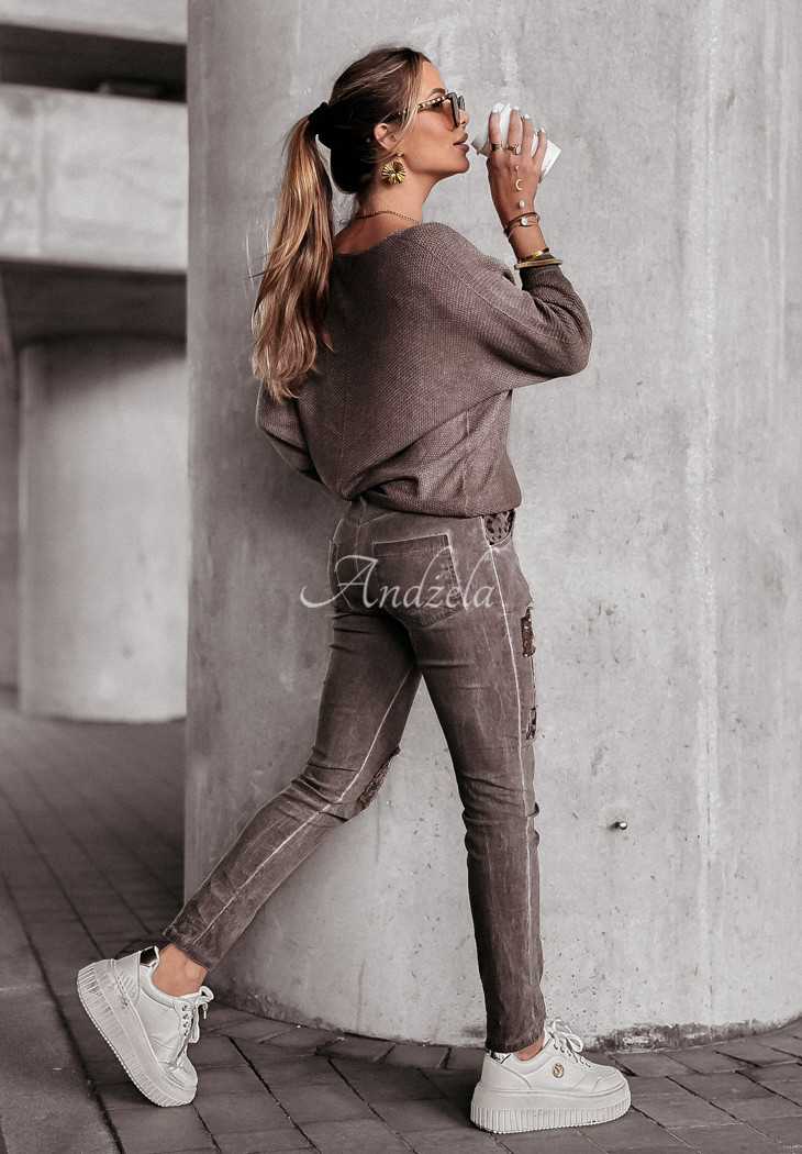 A remarkably lightweight sweater made of high quality material is an option that will work in any closet! It is distinguished by the print on the front, which is decorated with shiny gilding and silvering. It's a looser-weave model and oversized cut with a slightly longer back. It has 3/4 sleeves, as well as a rounded neckline.