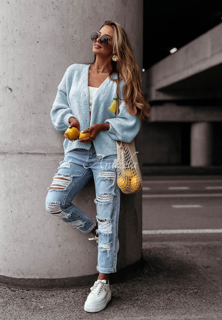 A soft wool-blend cardigan is a great choice for colder days. It is distinguished by decorative embroidered patterns located both on the front and back. It is an oversized cut model with a button closure. It has long sleeves, which, like the hem, are finished with ribbed trims.