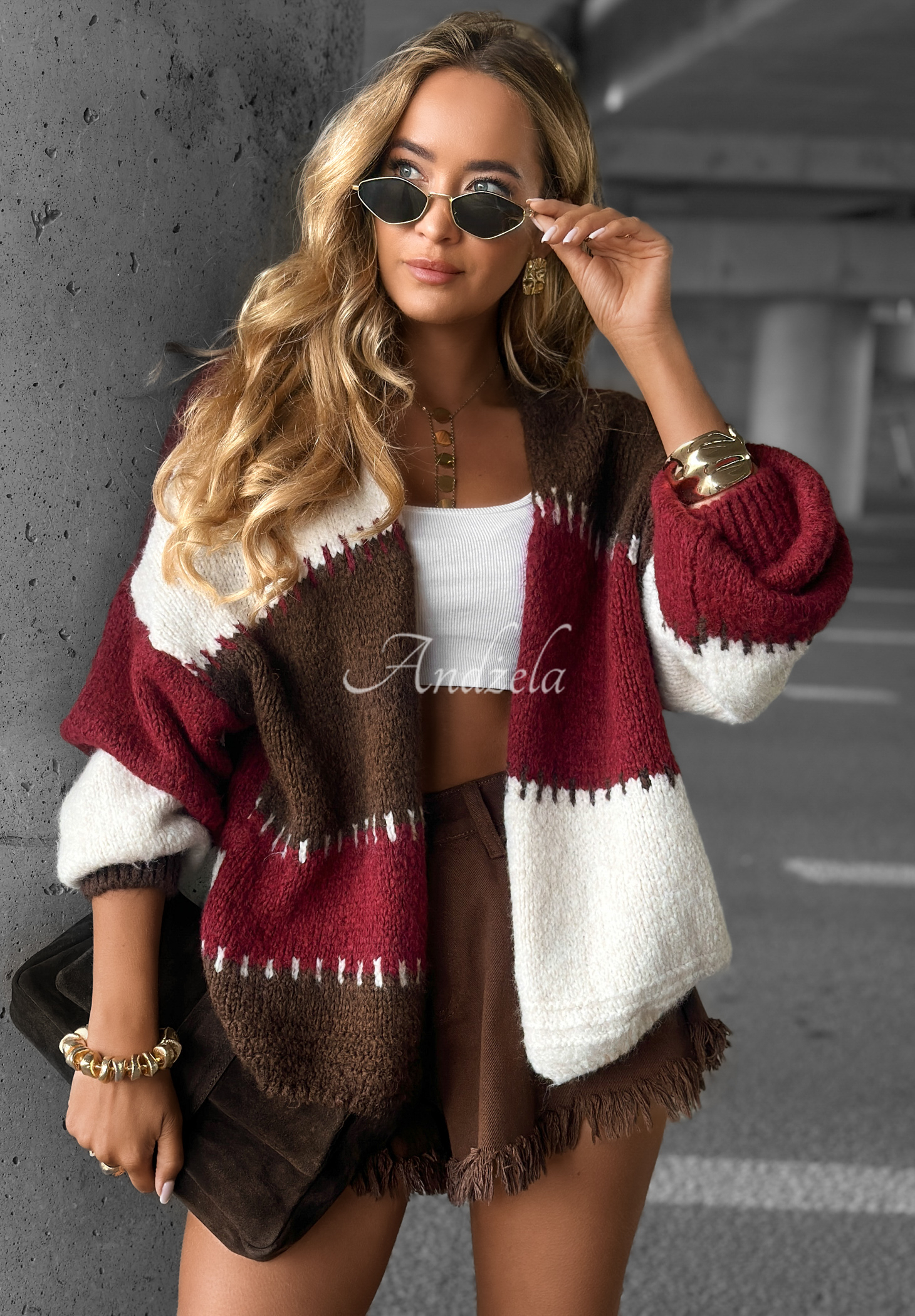 A lightweight wool-blend cardigan is a great option for colder days. It is a short, unbuttoned model with a lowered shoulder line. The sleeves, as well as the hem, are finished with ribbed cuffs.