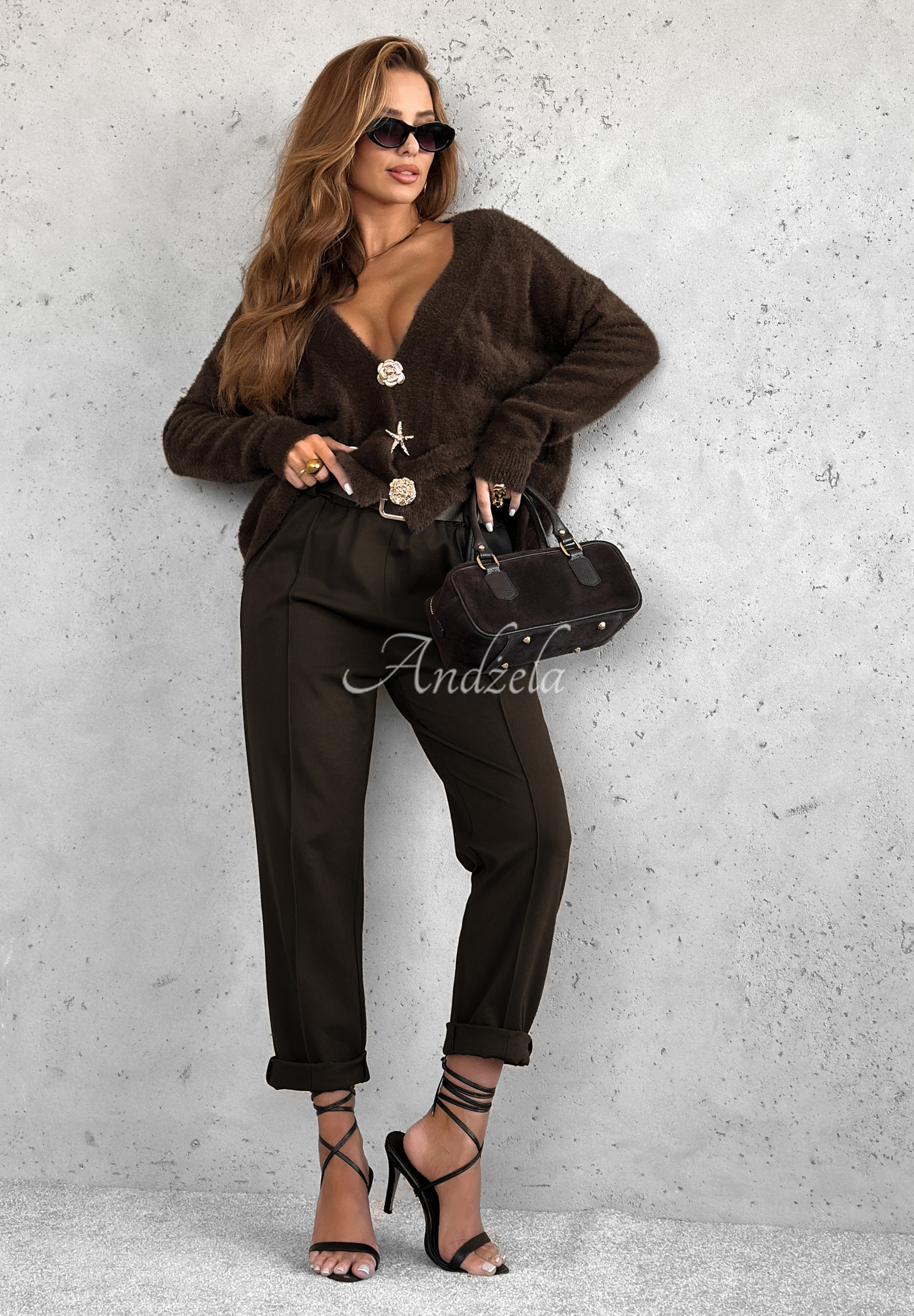 Short cardigan made of alpaca and viscose blended fabric. It is a model with a heart neckline, without a fastening. It is distinguished by fashionable gold brooches attached to the set.