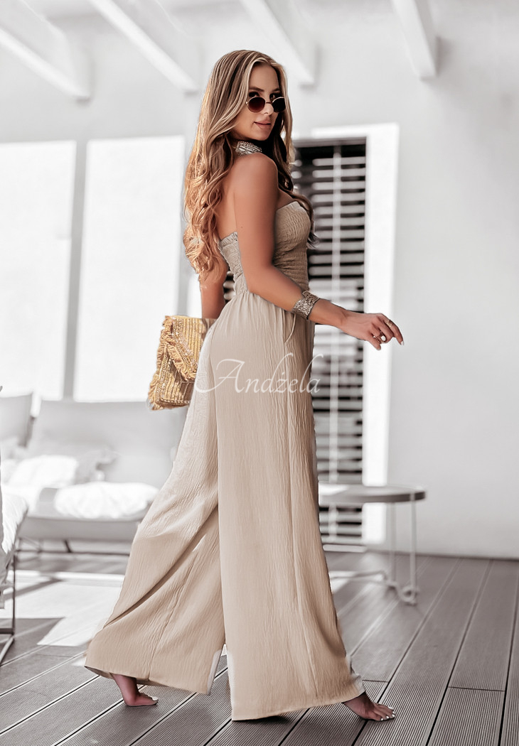 A long jumpsuit made of soft, airy fabric is a perfect choice for many occasions. Strapless model with a wide hem at the top, it also has pockets on the sides. An additional advantage are the wide legs, giving the whole a loose character and lightness.
