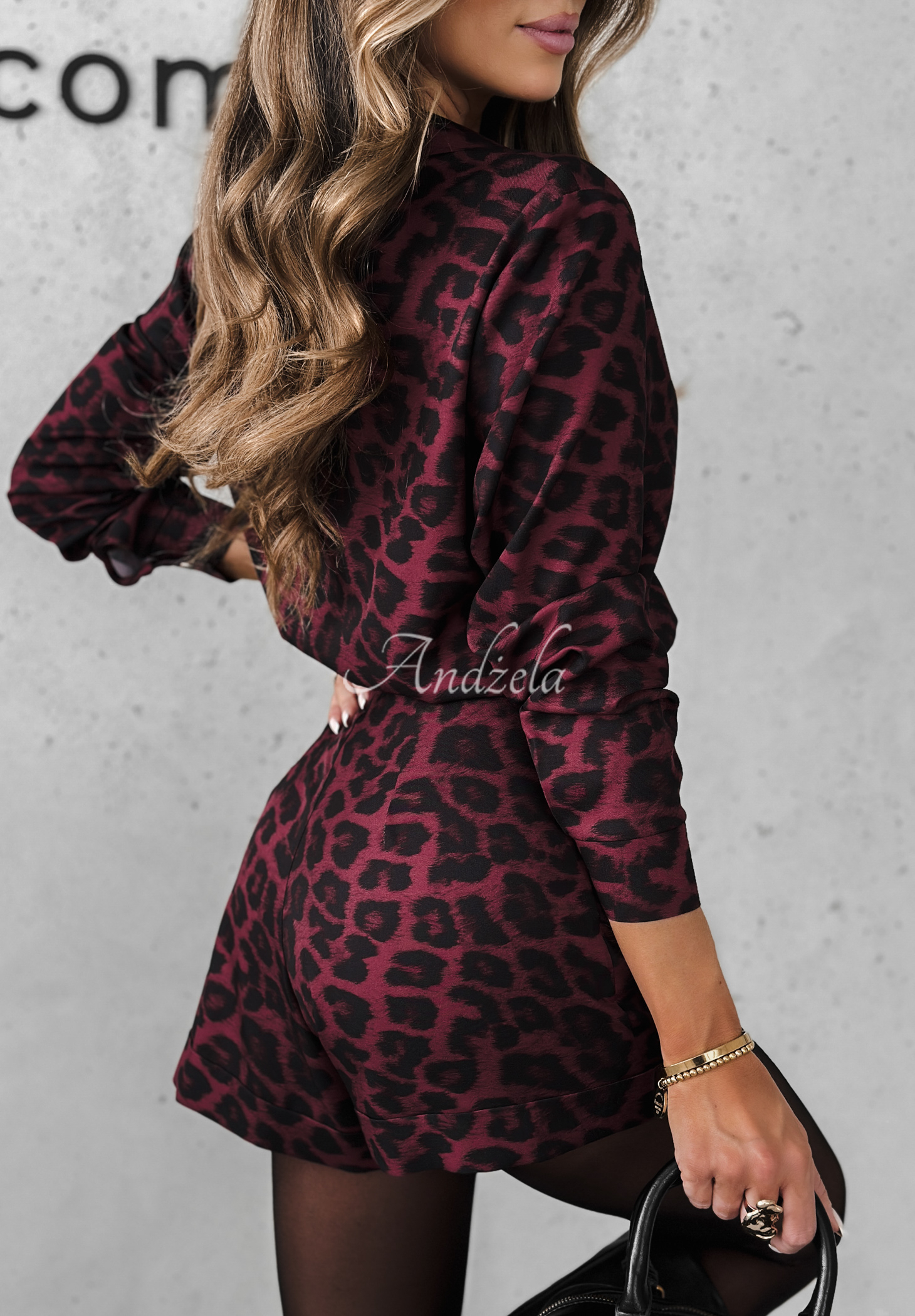Short jumpsuit in leopard print made of viscose fabric. It is a model with a collar, fastened with a row of buttons and a zipper. It has functional front pockets, as well as long sleeves with cuffs.