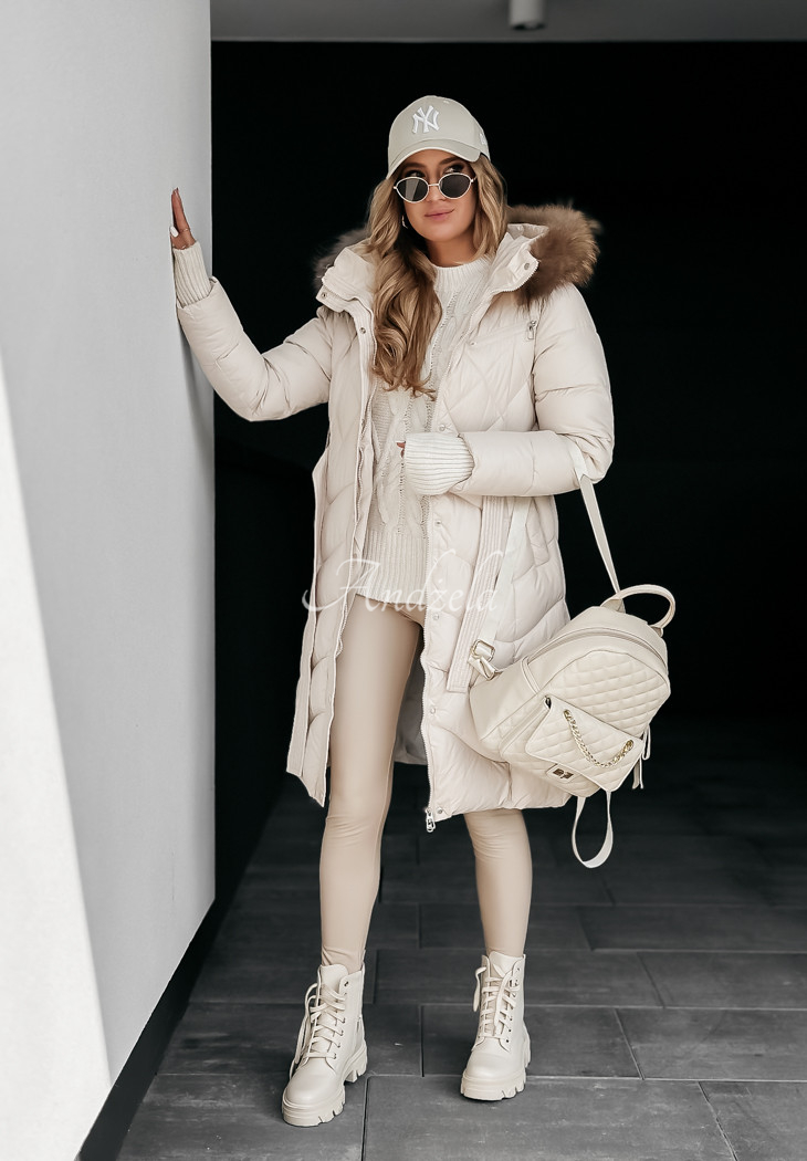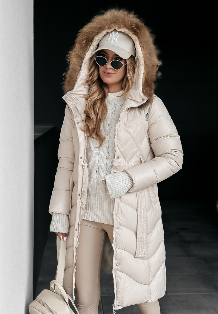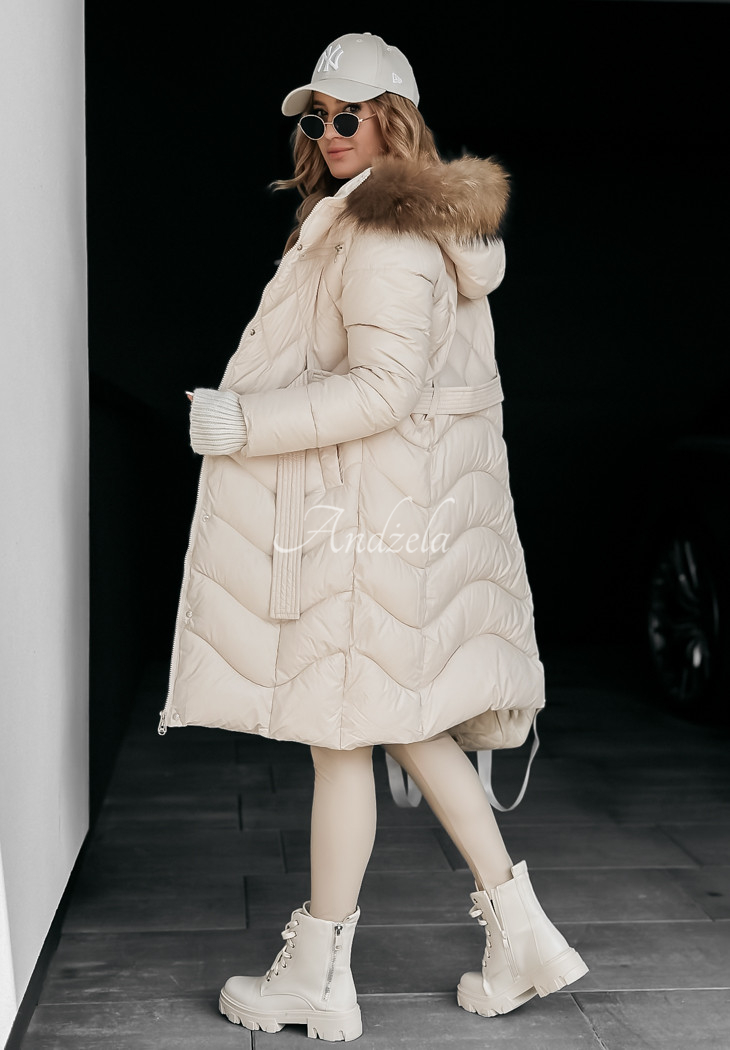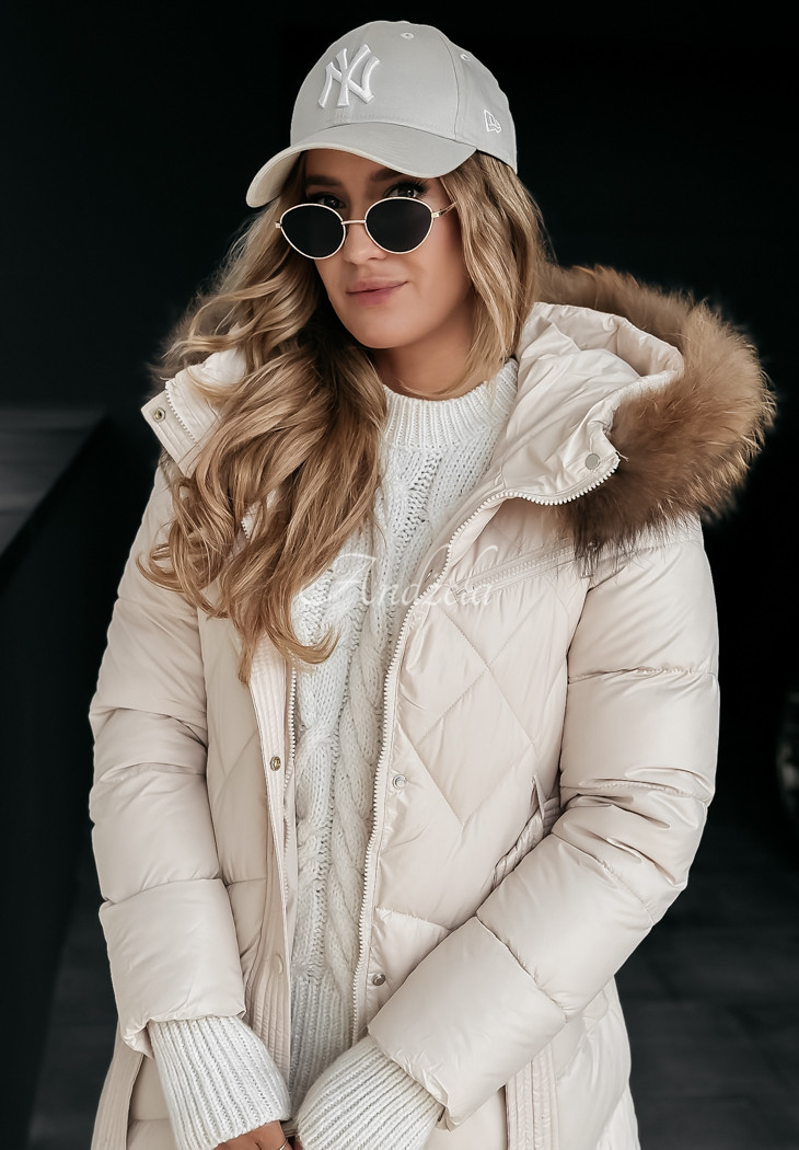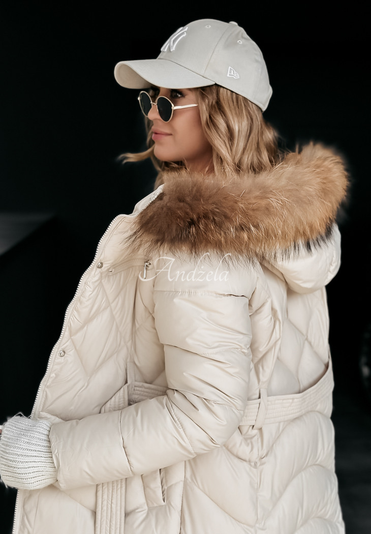 This quilted jacket of an elongated cut with natural fur at the hood is an offer that will perfectly protect against the cold, at the same time presenting itself really fashionable. The whole jacket is insulated with synthetic down, and is fastened with a zipper and press studs. It has two functional pockets and one imitation pocket. It comes with a belt, which will perfectly emphasize the silhouette and complete any look.