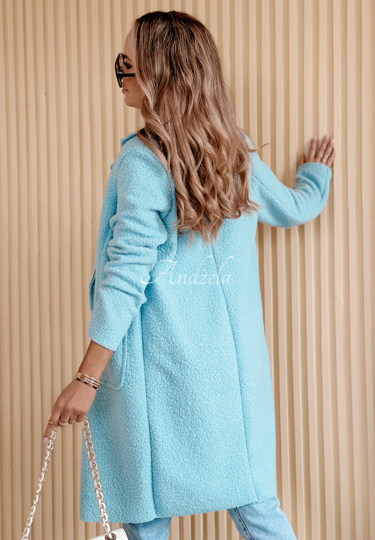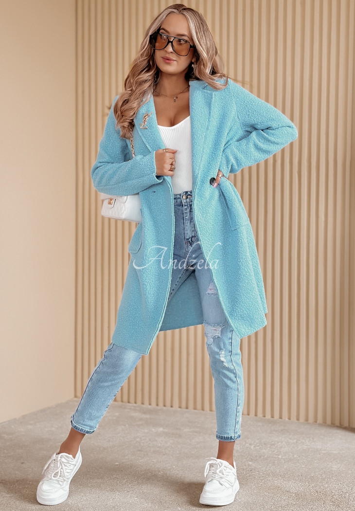 This faux sheepskin coat is perfect for transitional seasons. It features a longer cut with a collar and long sleeves. It fastens with two buttons and has functional front pockets.