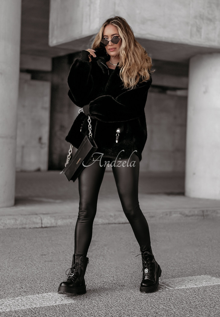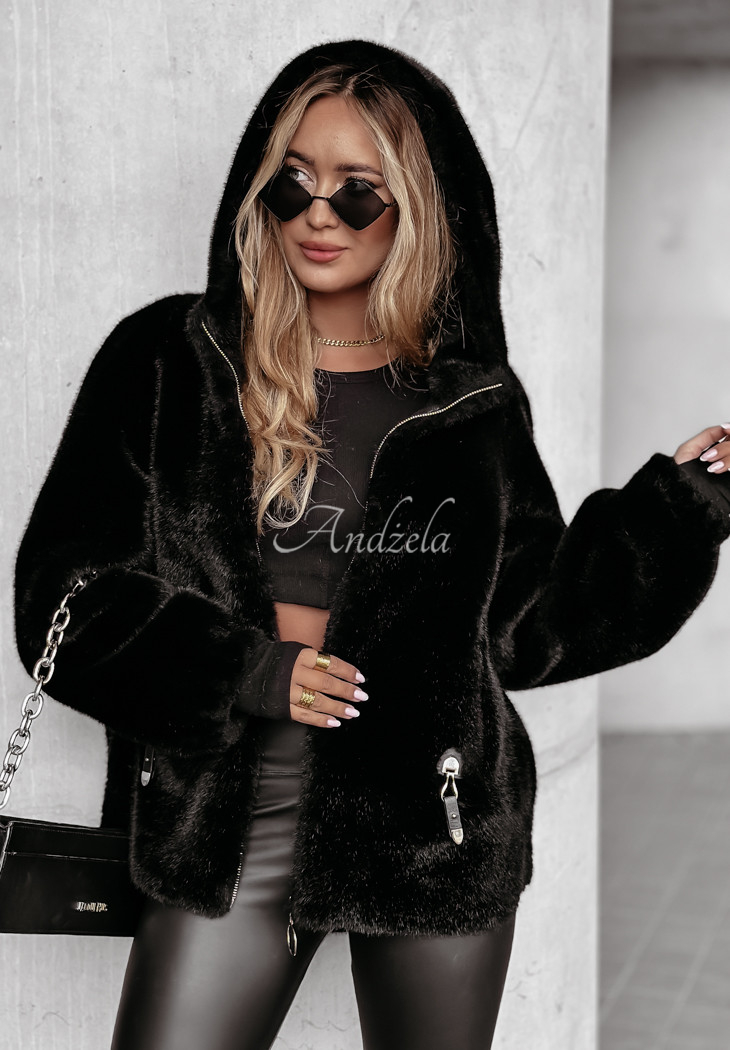 Short faux fur jacket with lightweight insulation and a large, functional hood is a great choice for colder days. The asymmetrical zippered model has ribbed cuffs and pockets.