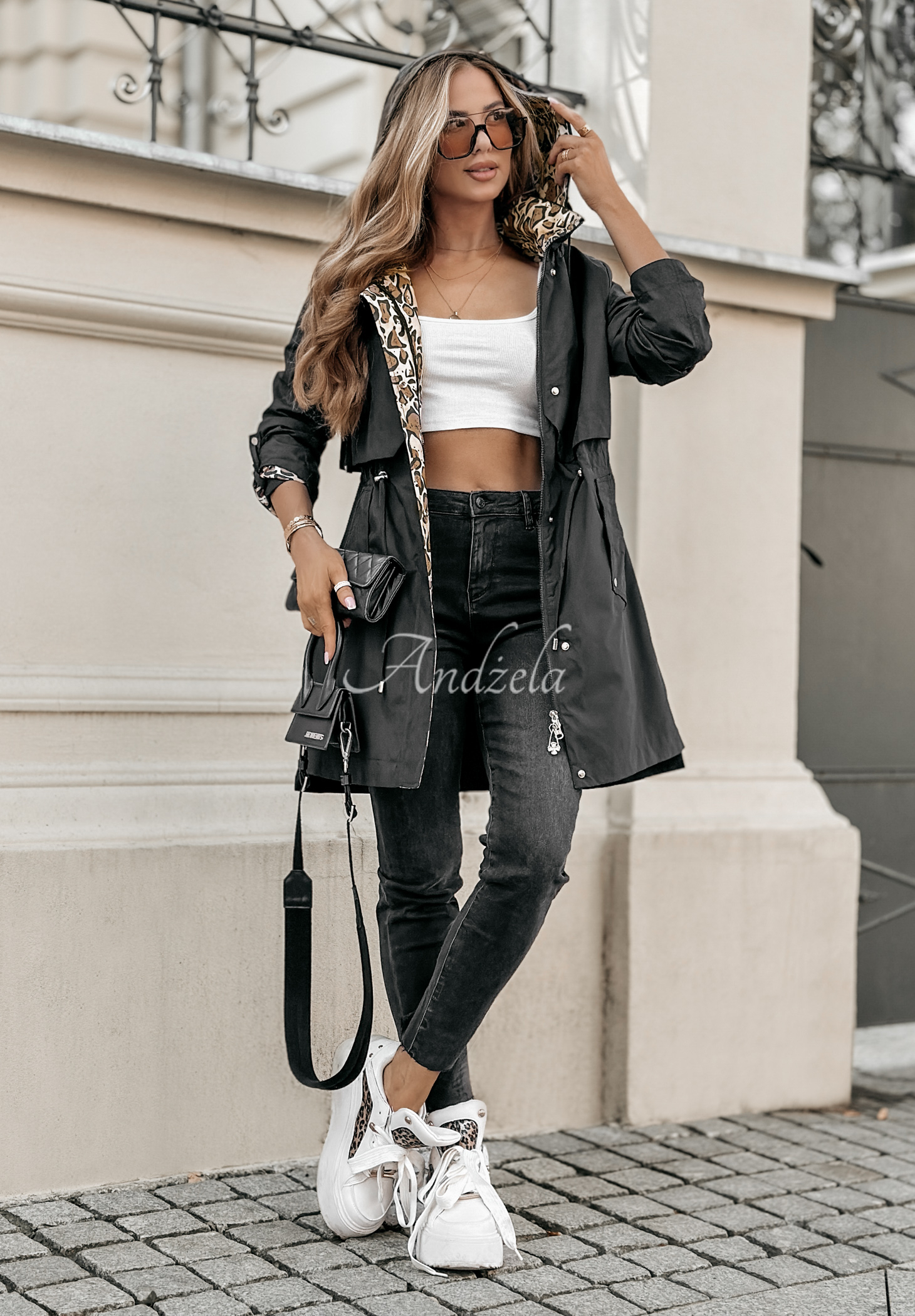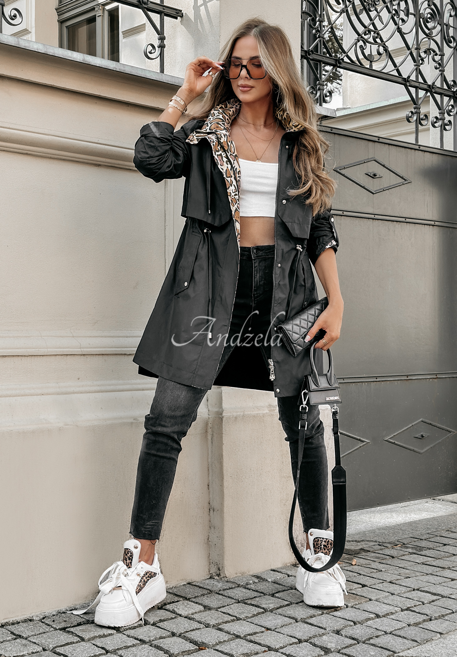 A lightweight parka with leopard print accents is the perfect choice for the start of the autumn-winter season. It's a model with a detachable hood, as well as adjustable sleeves. It is fastened with a zipper and press studs, has pockets on the front and a drawstring waist, allowing you to emphasize the assets of your figure. The whole piece will work phenomenally in basic loos for colder days.