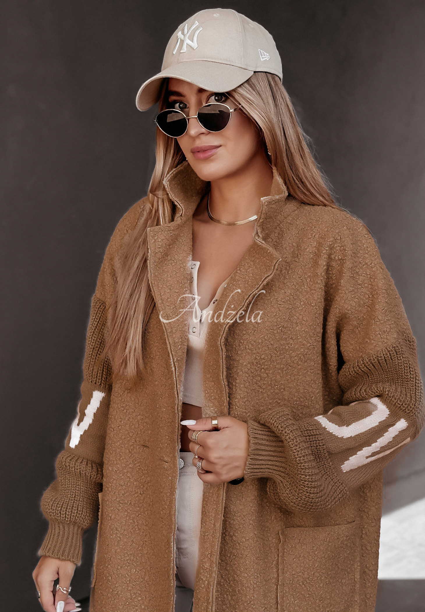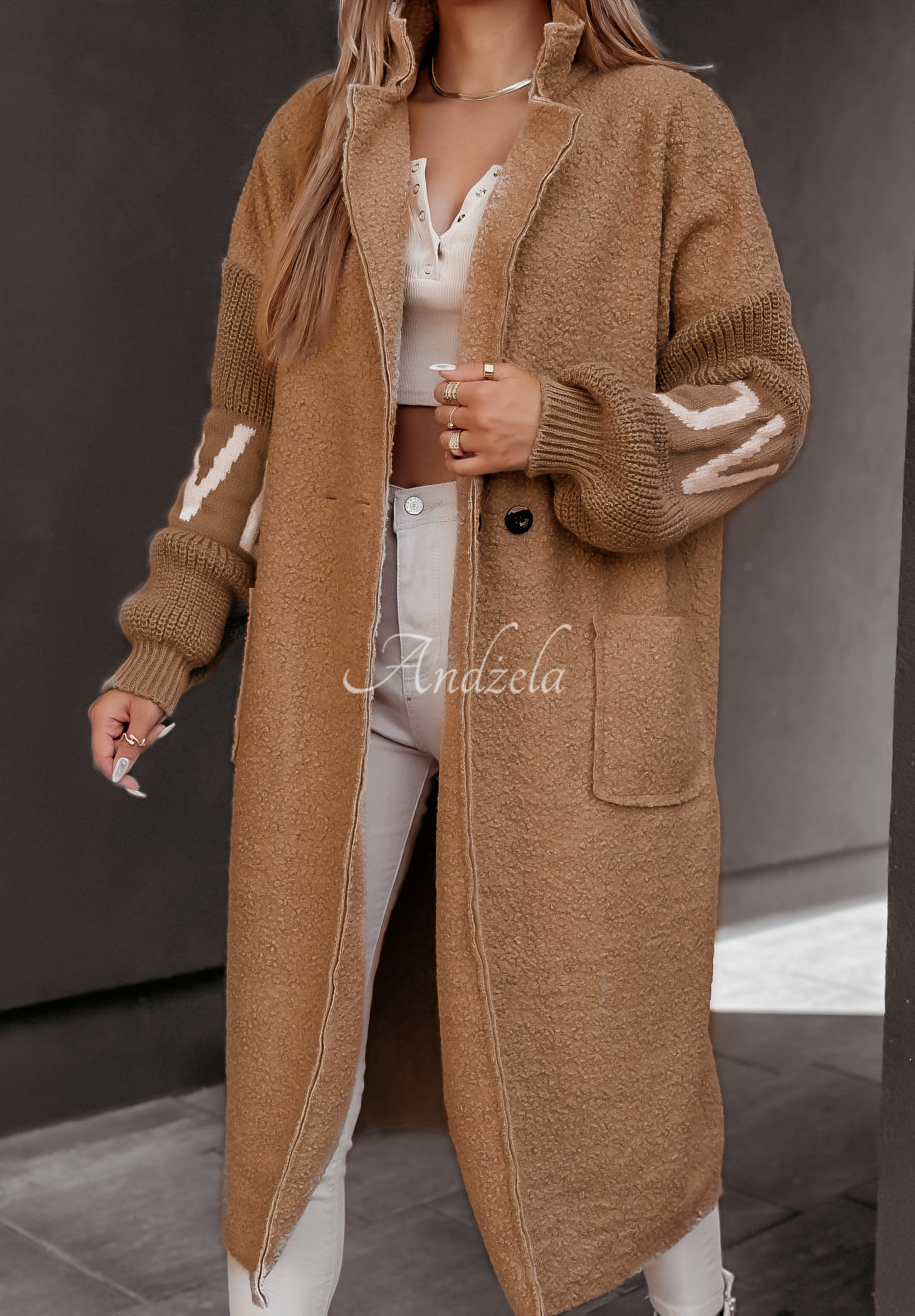 Buttoned imitation sheepskin coat is a great choice for cooler autumn days. The model with pockets on the front has sweater sleeves finished with ribbed cuffs. Available in two color versions.