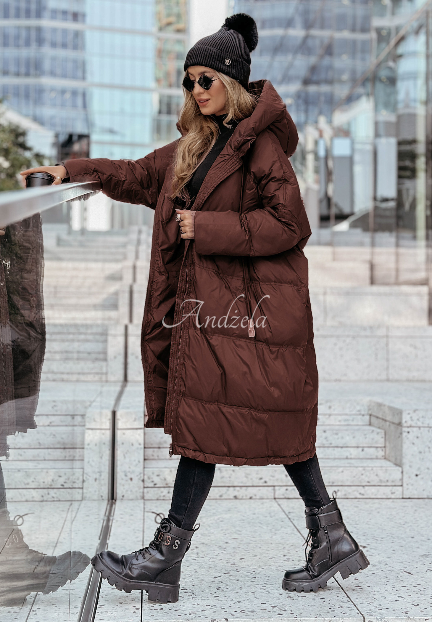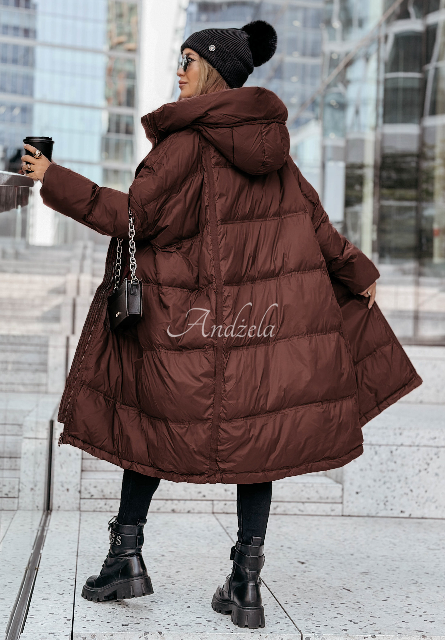 A lightweight down jacket with natural down ideal for the autumn-winter transition period. It is a quilted model with a long, oversized cut with a hood with ties. It is zippered, has long sleeves, as well as functional pockets. There is an adjustable drawstring at the bottom, allowing you to adjust the whole to your needs.