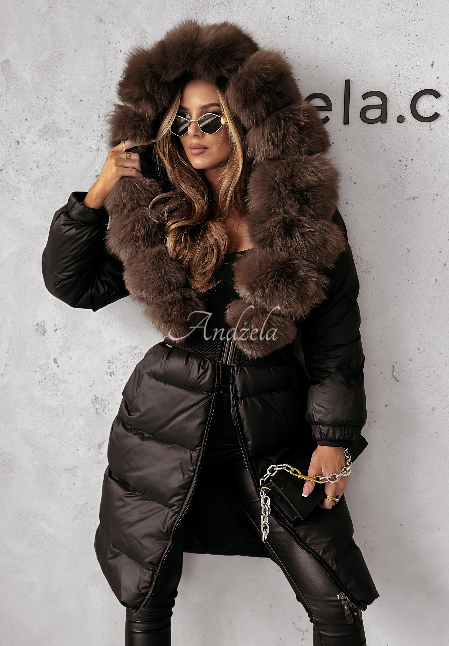 A warm down jacket with a hood is an indispensable part of the closet that every woman should be equipped with in the autumn-winter season! It is an offer made of high-quality materials, containing natural filling and fur, which is detachable. It has functional pockets on the front and welts at the hood and sleeves. It is zippered, and the whole thing is completed with a belt, which perfectly emphasizes the waist. This is an excellent choice for colder days!